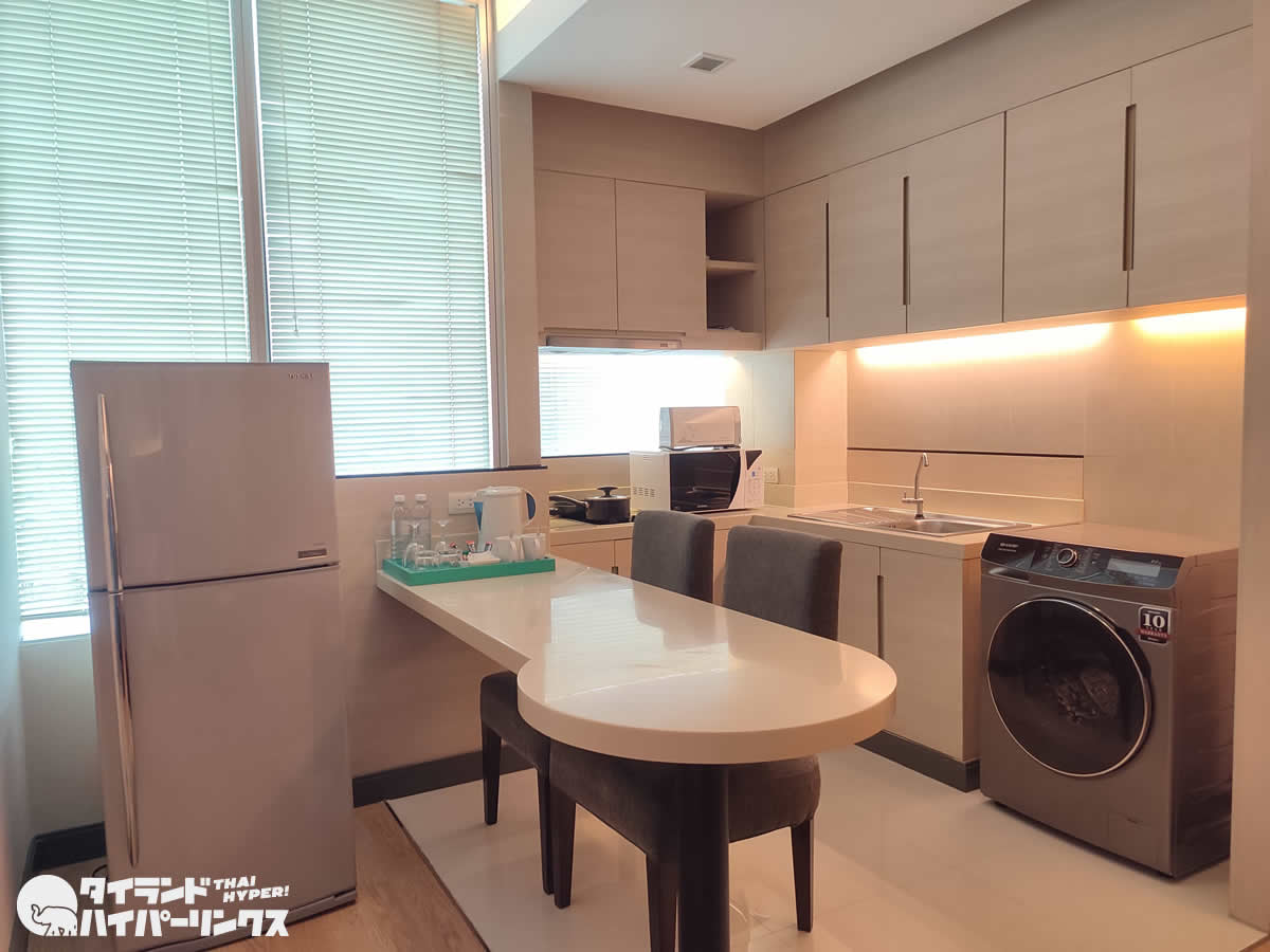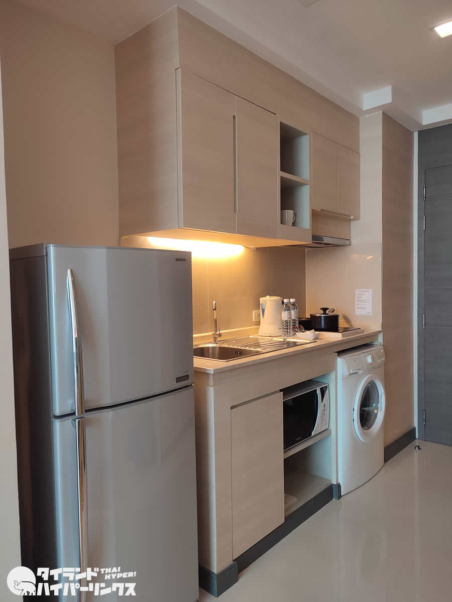なお、同じ「デラックス シティビュー」でも長期滞在、つまりサービスアパートメント用の客室はキッチン付き。大きな冷蔵庫と電子レンジ、さらに洗濯機もついています。