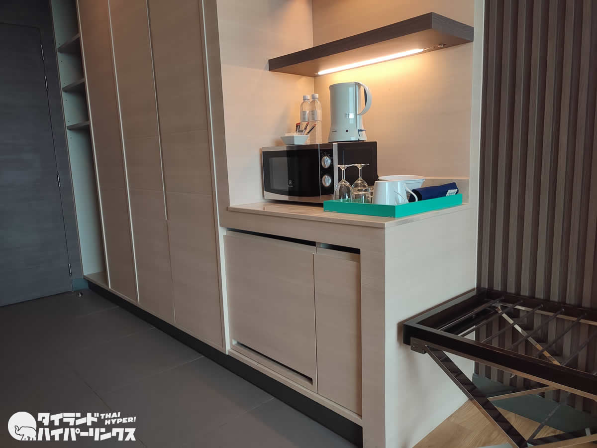 なお短期滞在、つまりホテルとしての利用の客室にはキッチンはなく、ミニバーと収納になっています。