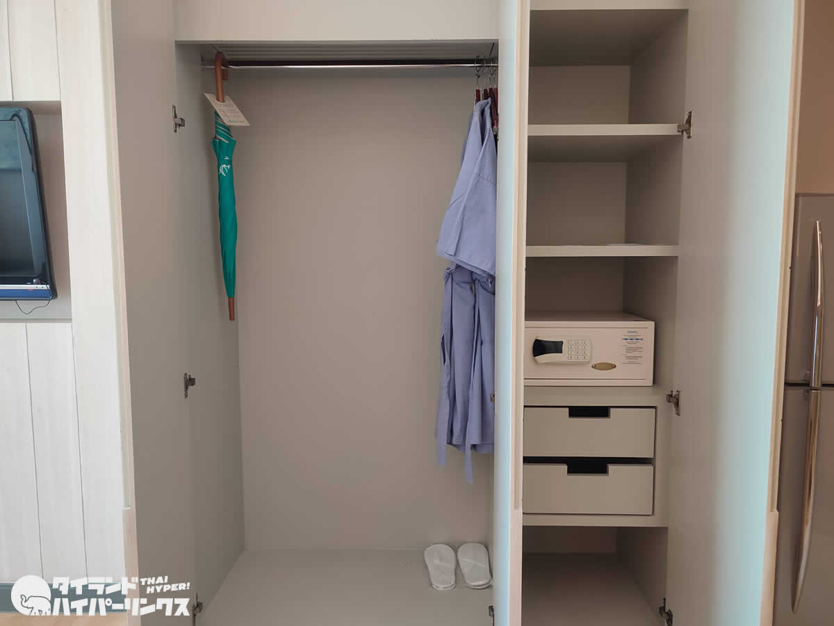 クローゼットには、傘、バスローブ、セーフティボックス。