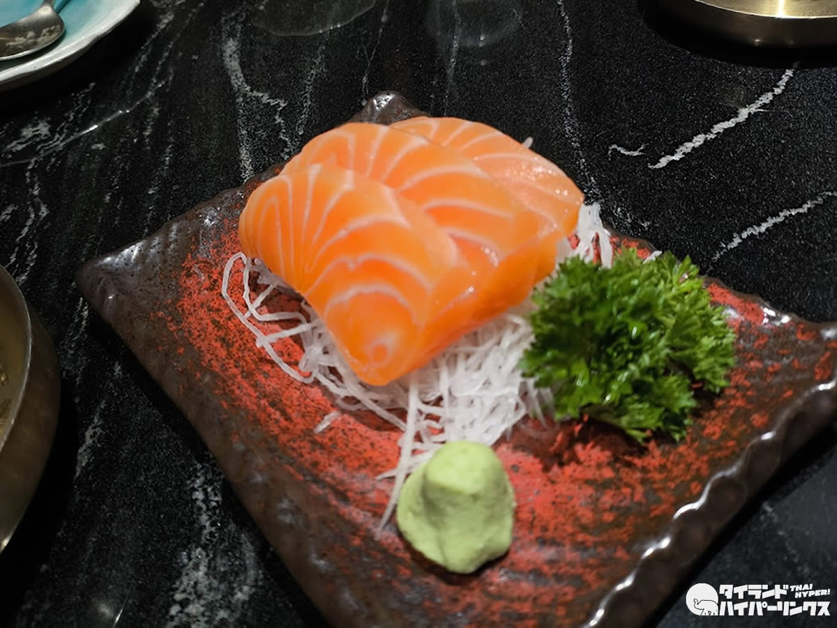 「濟州<JEJU>」は、韓国料理のコースが楽しめるお店ですが、お寿司の「おまかせ」もやっているので、立派な寿司カウンターがありました。そのためメニューにはお寿司など日本料理もあって、今回いただくことになる韓国料理のコースにも、サーモンの刺し身が付いてきたんです。