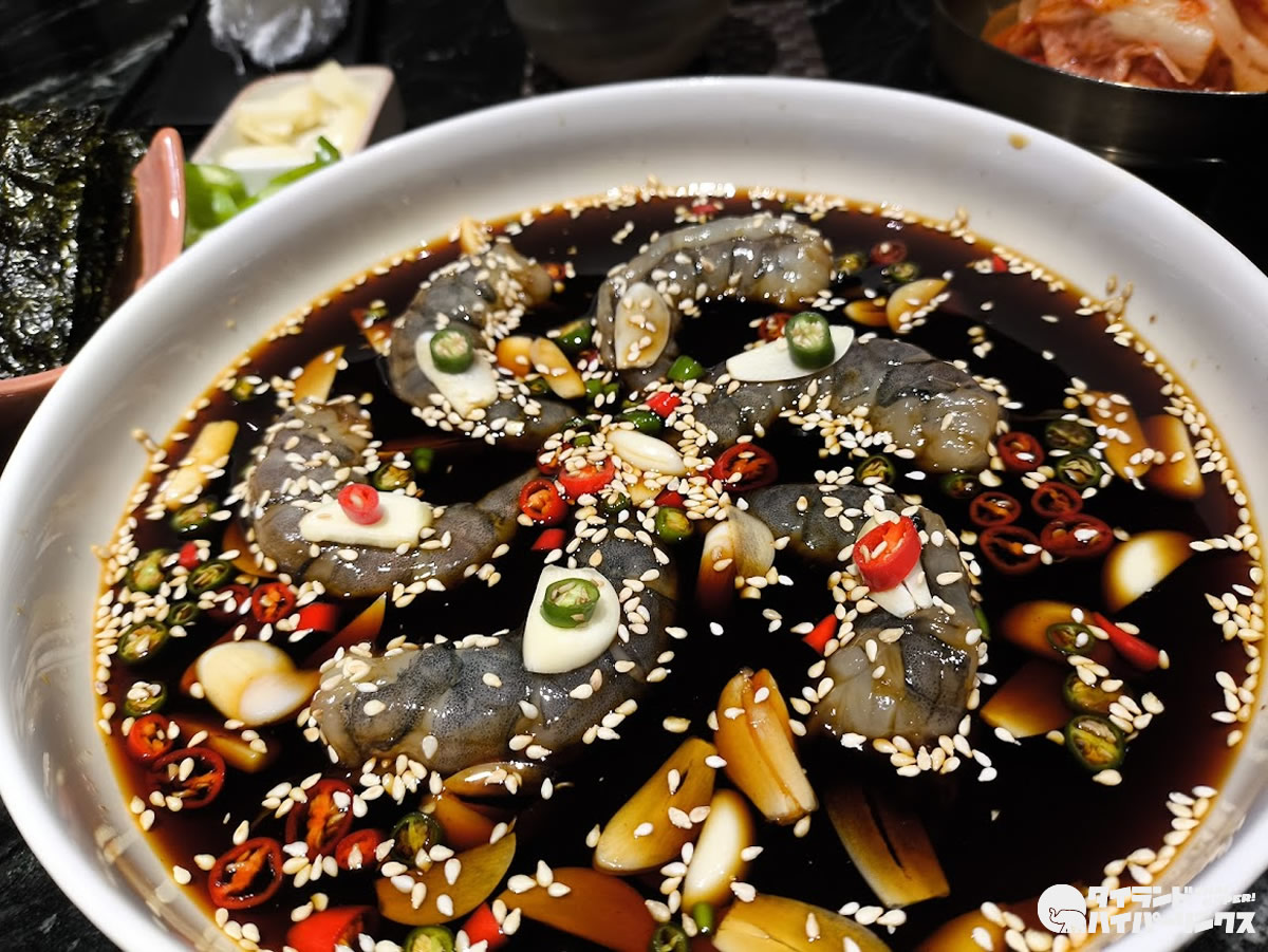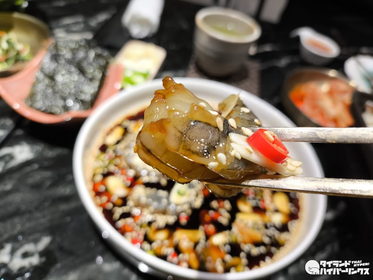 醤油漬けのカンジャンセウは、タレに浸かることでエビの身が締まって歯ごたえが増して、その食感がたまりません!