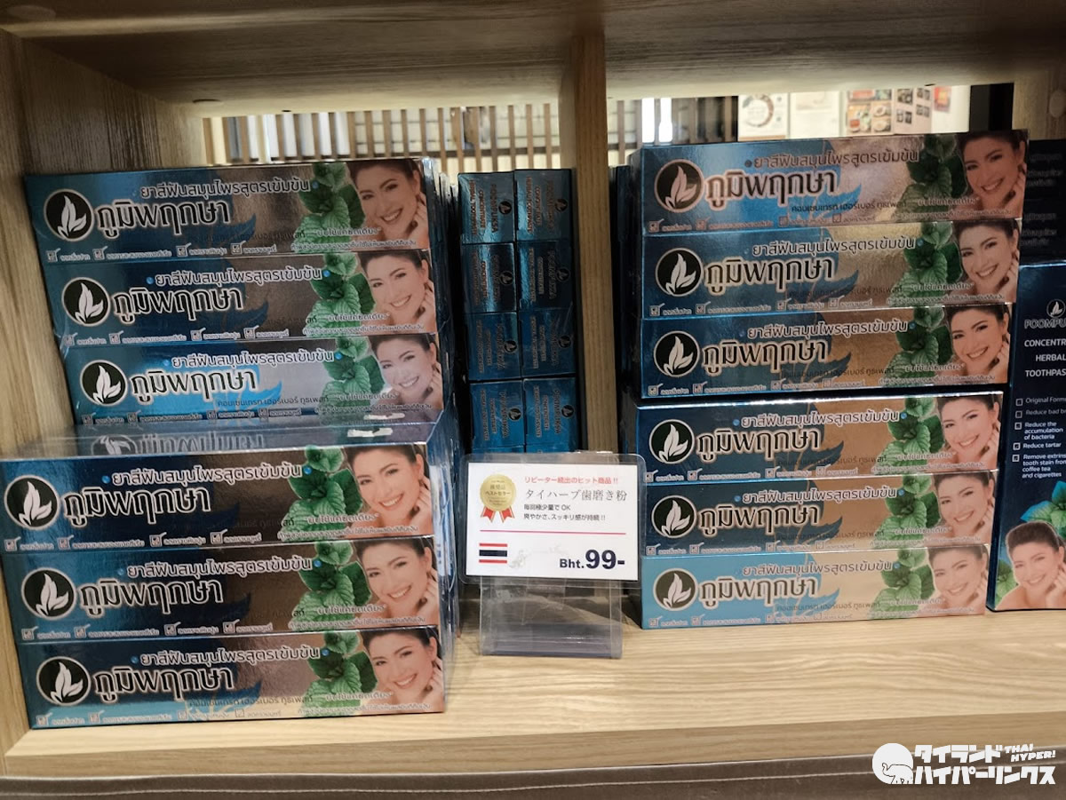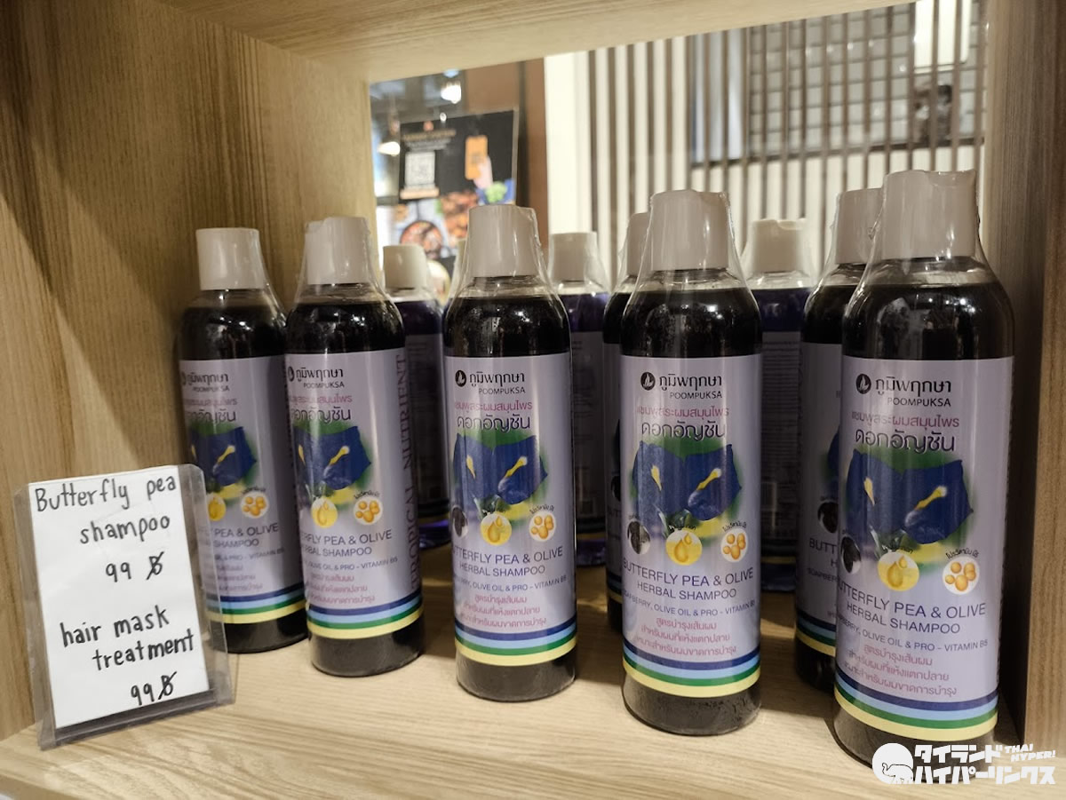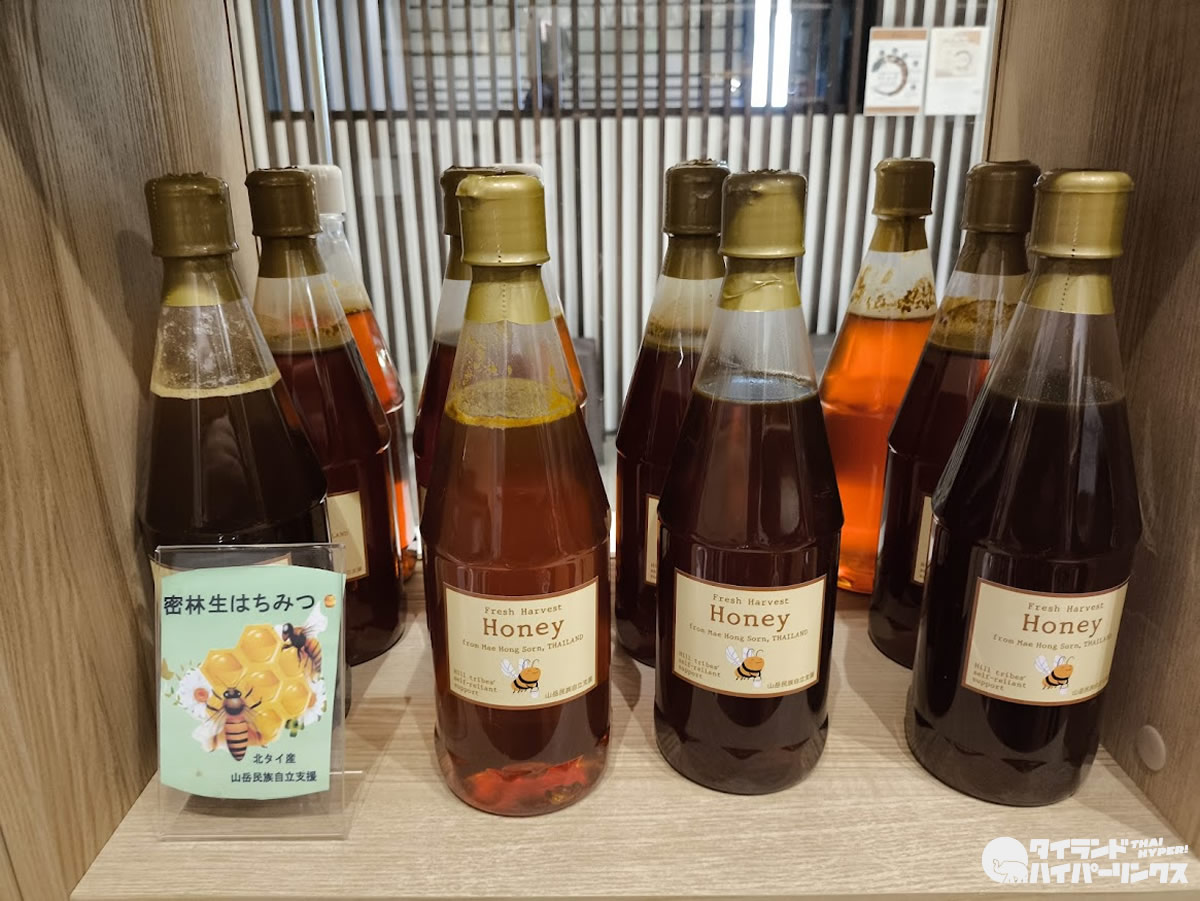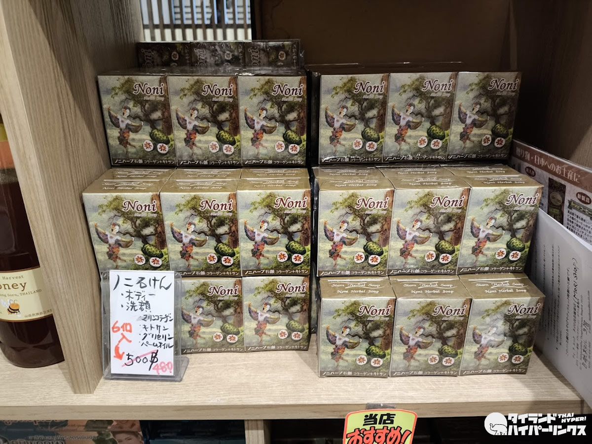 セレクトされたお土産が並ぶ中、ベストセラーになっているのがノニ石鹸やタイハーブの歯磨き粉、パタフライピーのシャンプーや蜂蜜など。