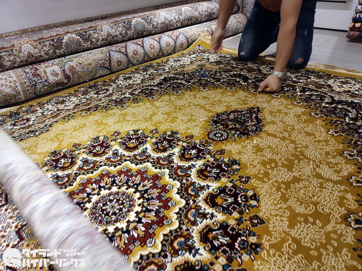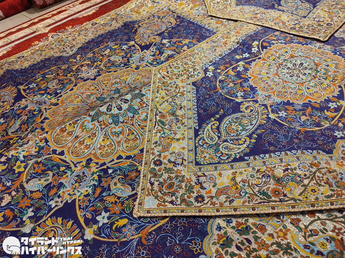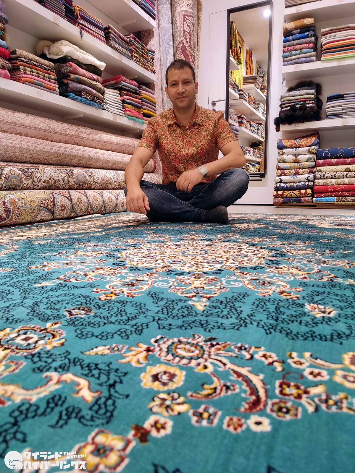 例えば、下の写真で店主が座っているブルーのシルクの絨毯は、とても大きなサイズで14万5000バーツ(約54万円)。それが今なら20%オフで11万6000バーツ(約43万円)。高級な絨毯は洗浄やメンテナンスをしながら何十年も使用出来るので、例えば50年使ったとして年間8600円ですって!安い!