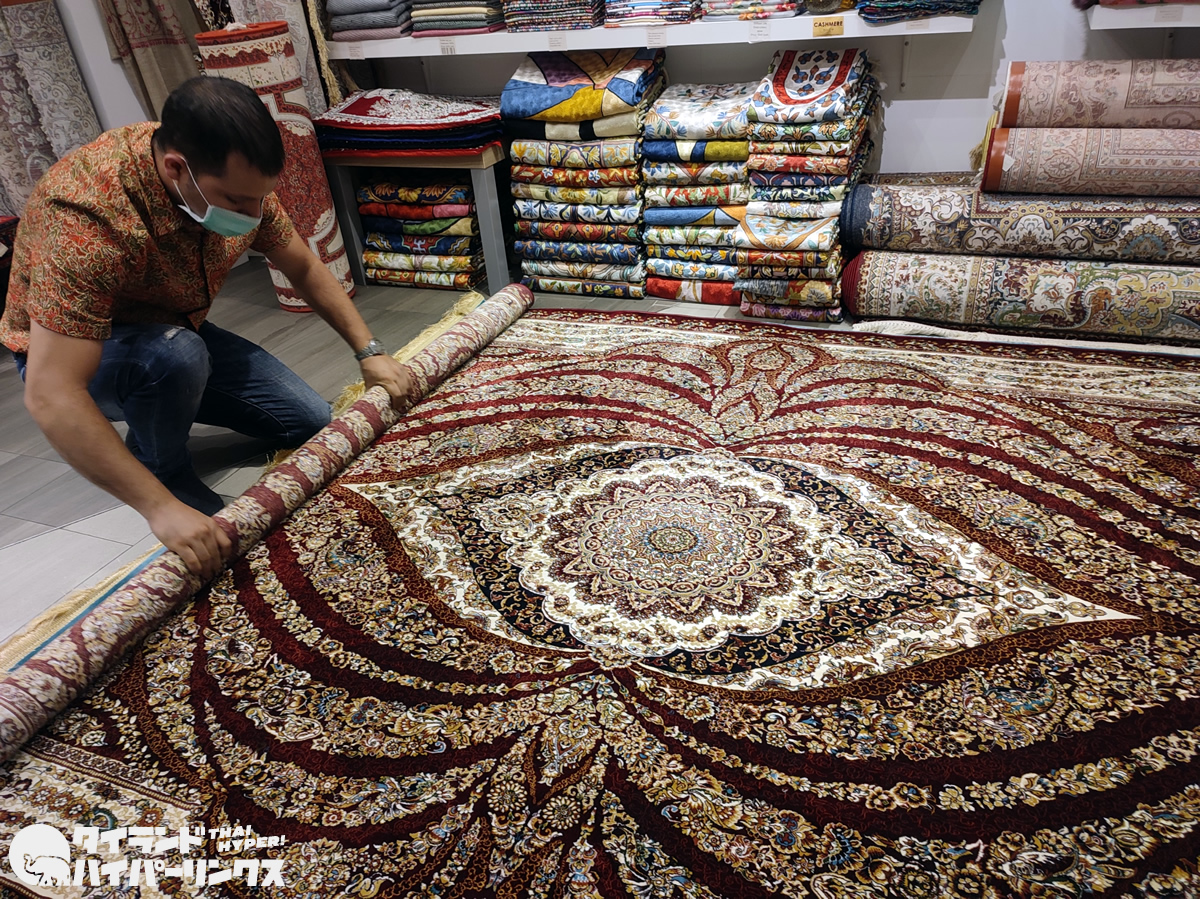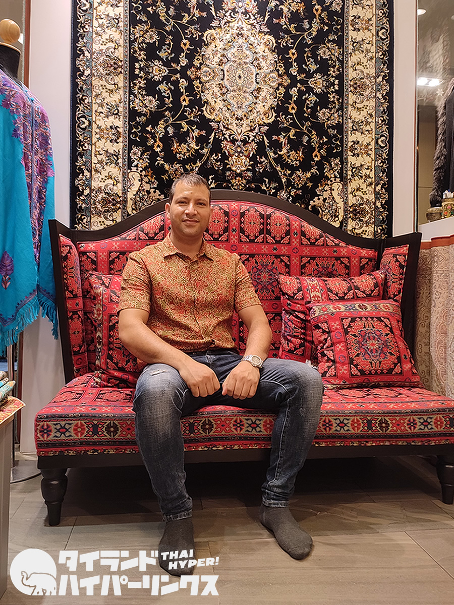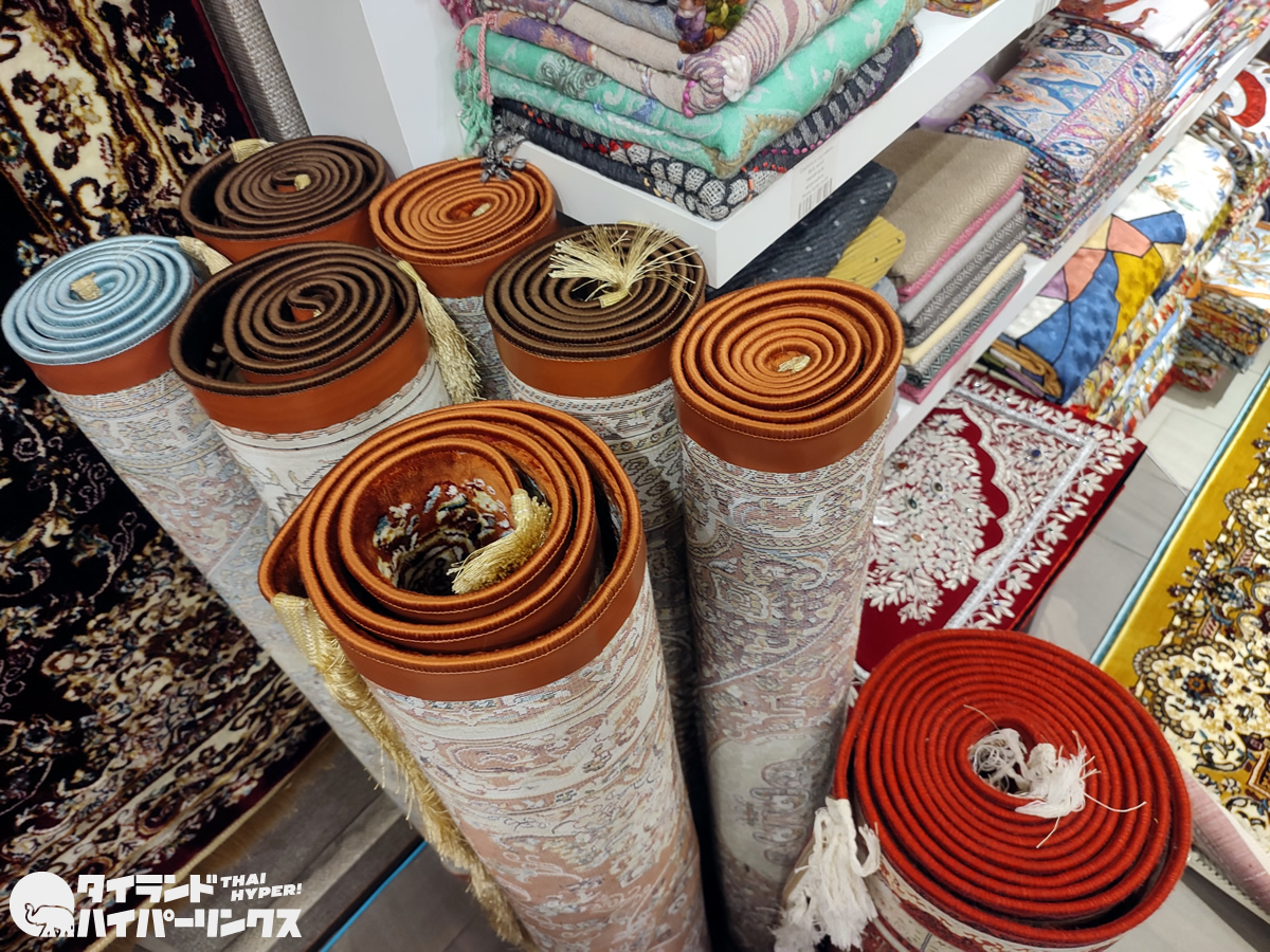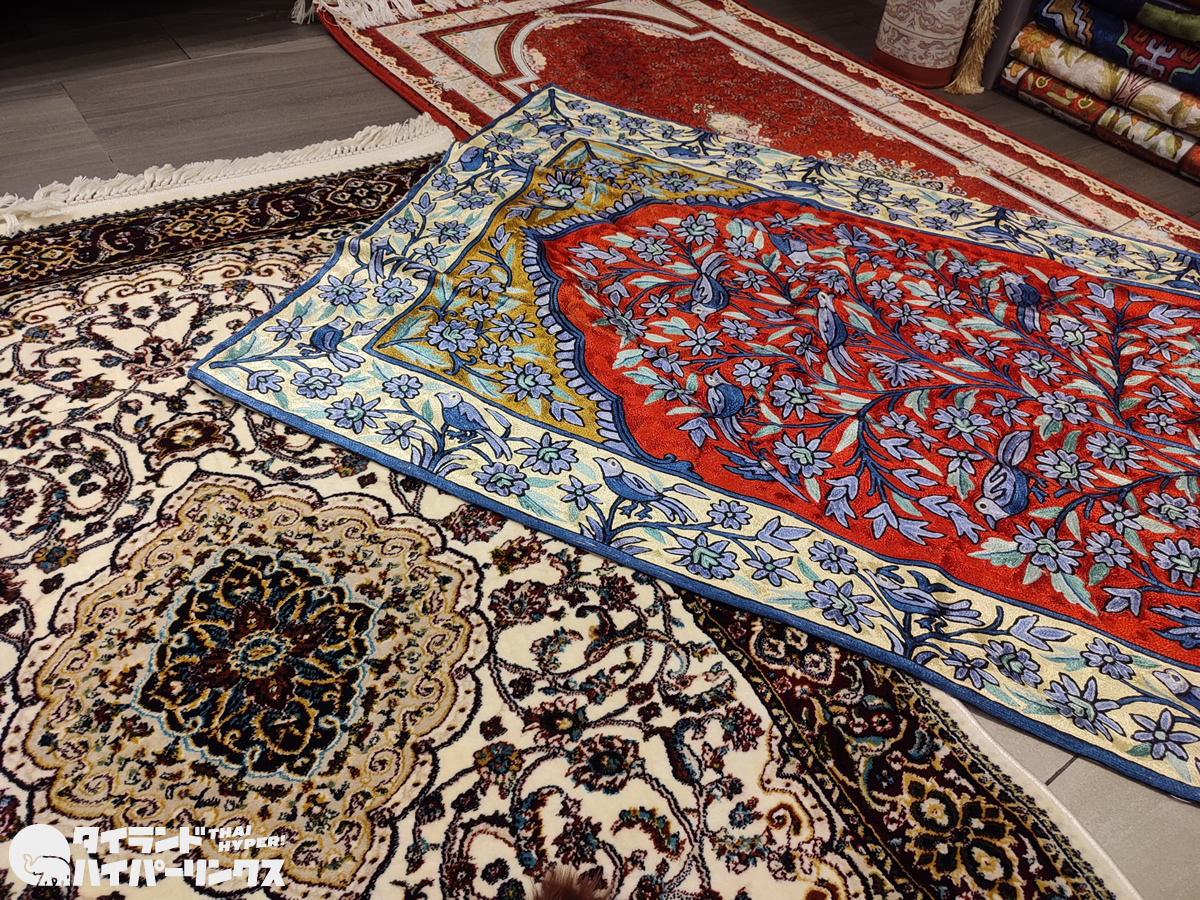 例えば、下の写真で店主が座っているブルーのシルクの絨毯は、とても大きなサイズで14万5000バーツ(約54万円)。それが今なら20%オフで11万6000バーツ(約43万円)。高級な絨毯は洗浄やメンテナンスをしながら何十年も使用出来るので、例えば50年使ったとして年間8600円ですって!安い!