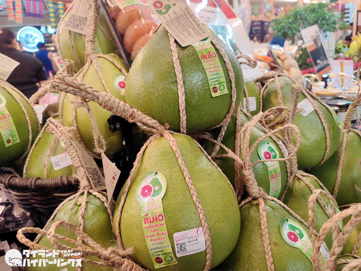 この大きな柑橘類はソムオー。英語ではポメロ、日本ではザボンと呼ばれますが、これもタイの名産。