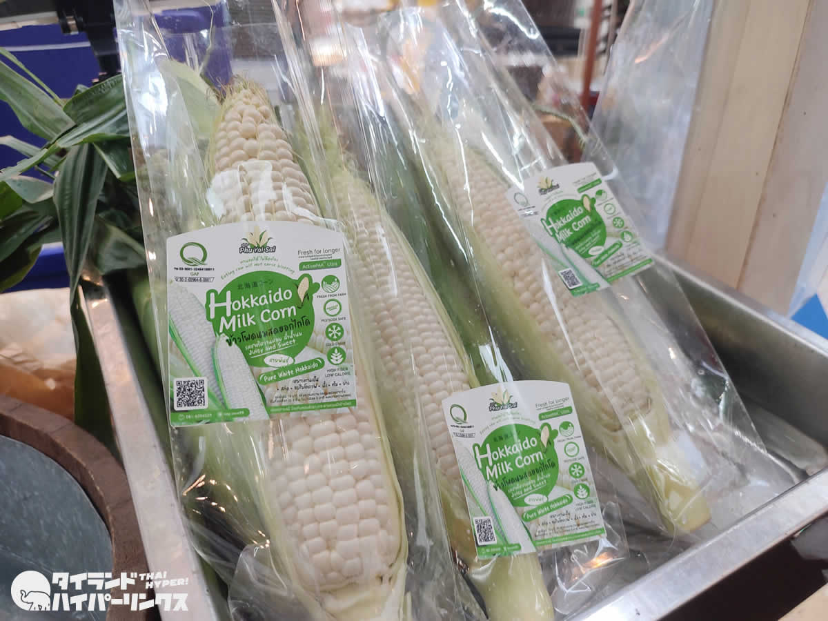 コラートのファームプーヤイサイ(ฟำร์ม ภูใยใส)という農場で作られた真っ白なトウモロコシ「北海道ミルクコーン」が大人気。実はこれは生で食べることができ、甘くてとっても美味しいんのです!売れ行きは非常に好調で、なんとかトウモロコシを買うことはできましたが(1本50バーツ)、このトウモロコシで作ったジュース、スイートコーンミルクは売り切れで買うことができませんでした・・・。なので、売り切れる前に、早めにこの店を訪れるのがおすすめです。
