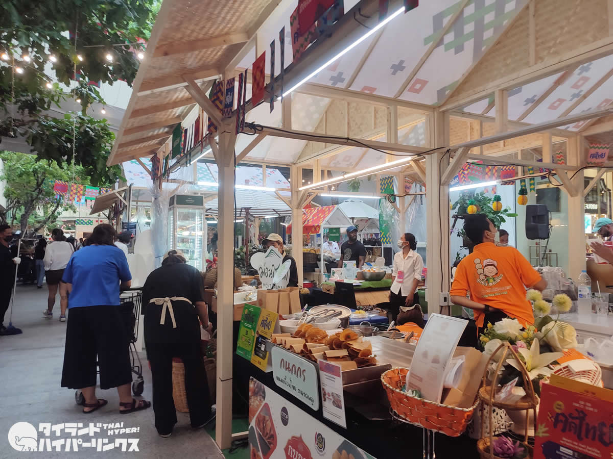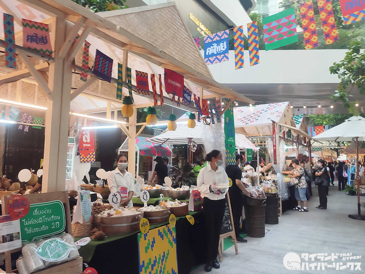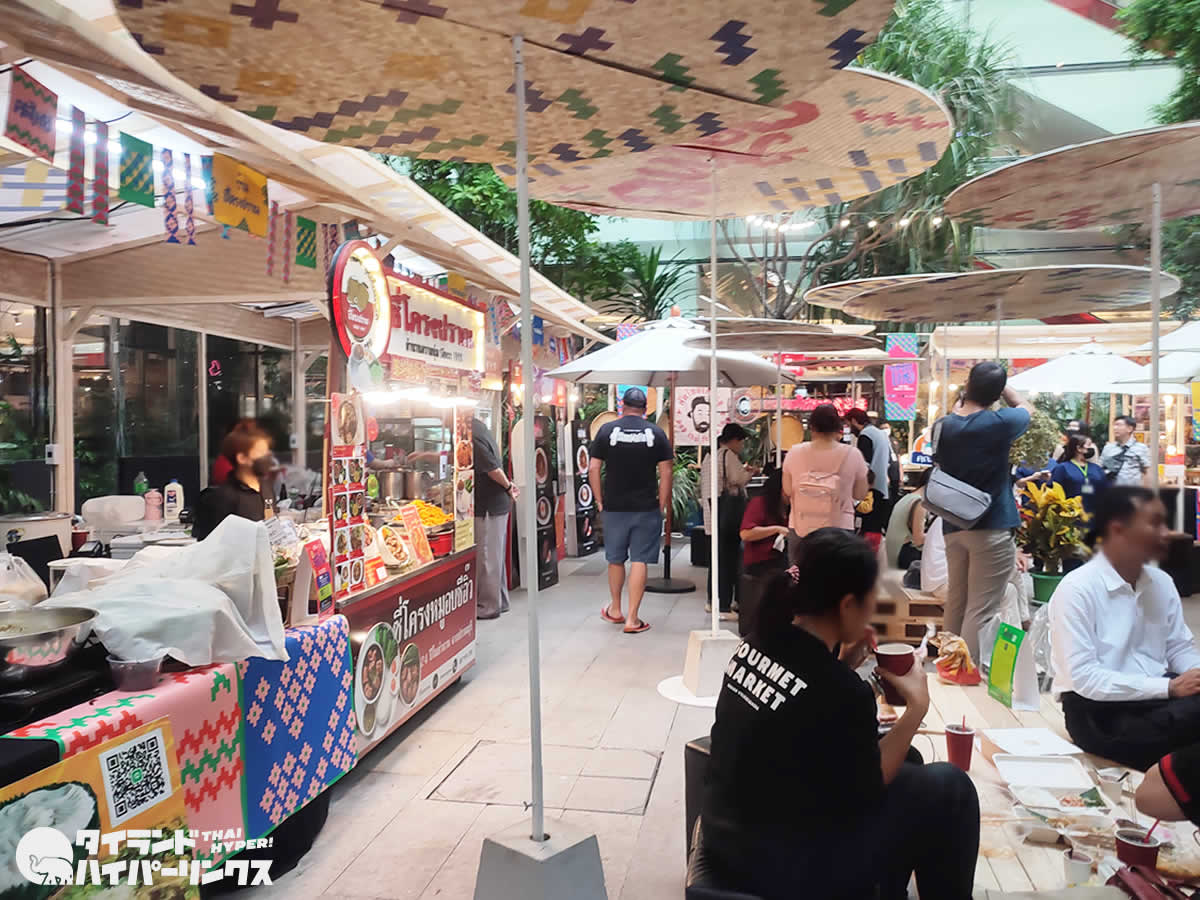 エムクォーティエの中庭、グランドフロアのクォーティエアベニューでは2023年5月9日(火)から16日(火)までの期間限定で、クッドタイ(KUD-THAI、คัดไทย)が開催。まるで縁日のようにたくさんの屋台が出店し、タイ全土の美味し料理や、タイ独自の製品、果物や野菜など最高の農産物が並び、初日からたくさんの人で賑わっていました。