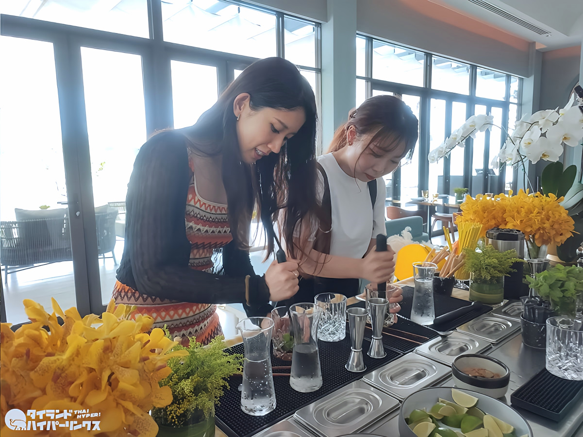 ハーブやミニトマトを摘んだら、エアコンが効いた「Favola」店内へ向かい、摘みたてのミントでモヒート作り体験です。ノンアルコールにすることもできます。
