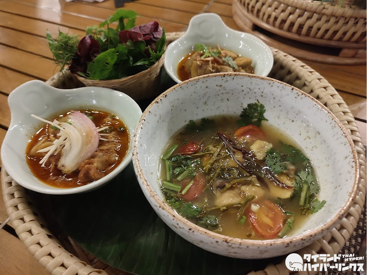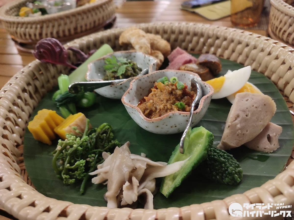 茹で野菜やソーセージを、トマトの風味のナムプリックオンと青唐辛子を焼いて潰したナムプリックヌムにディップして食べる、北タイ料理の美味しさが詰まった前菜からスタート。