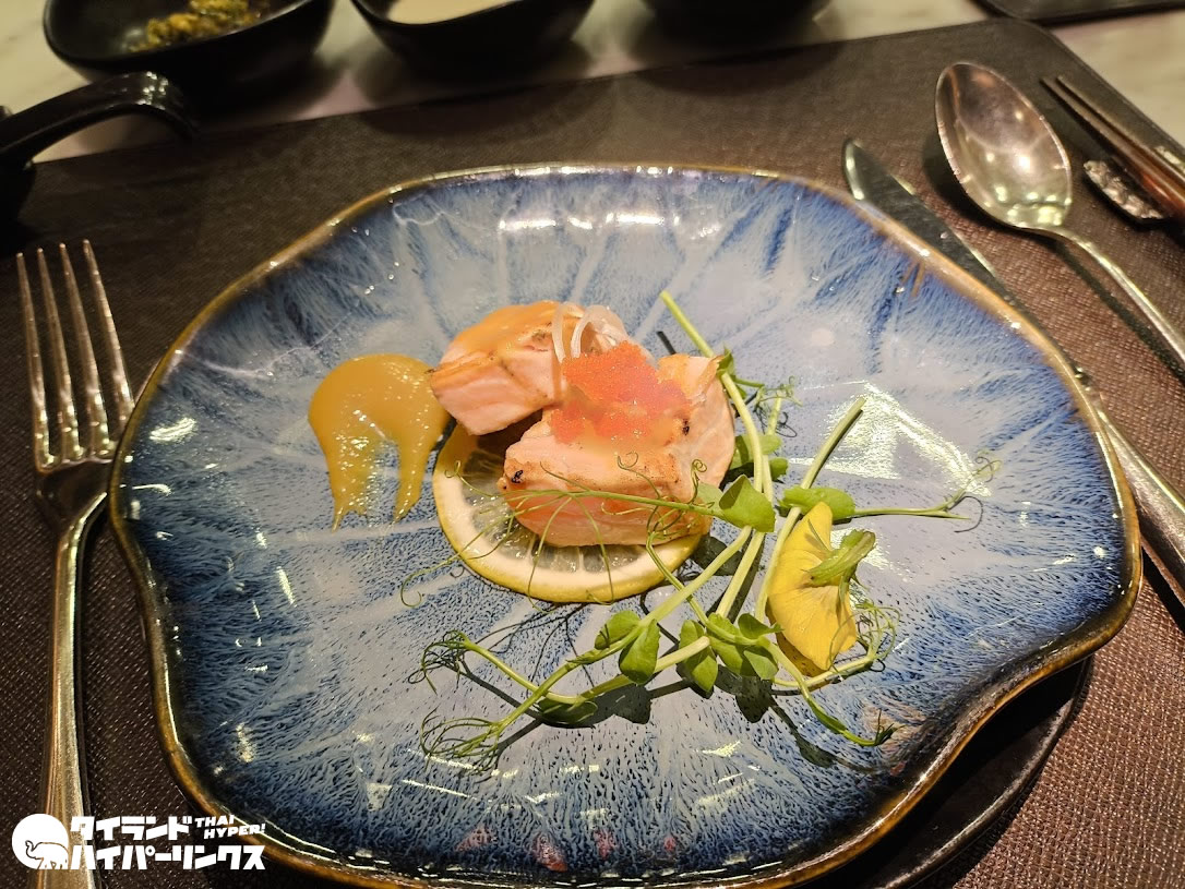 したの写真はアラカルト料理で、シェフが目の前で焼いたサーモンに柚子味噌が添えらたものです。