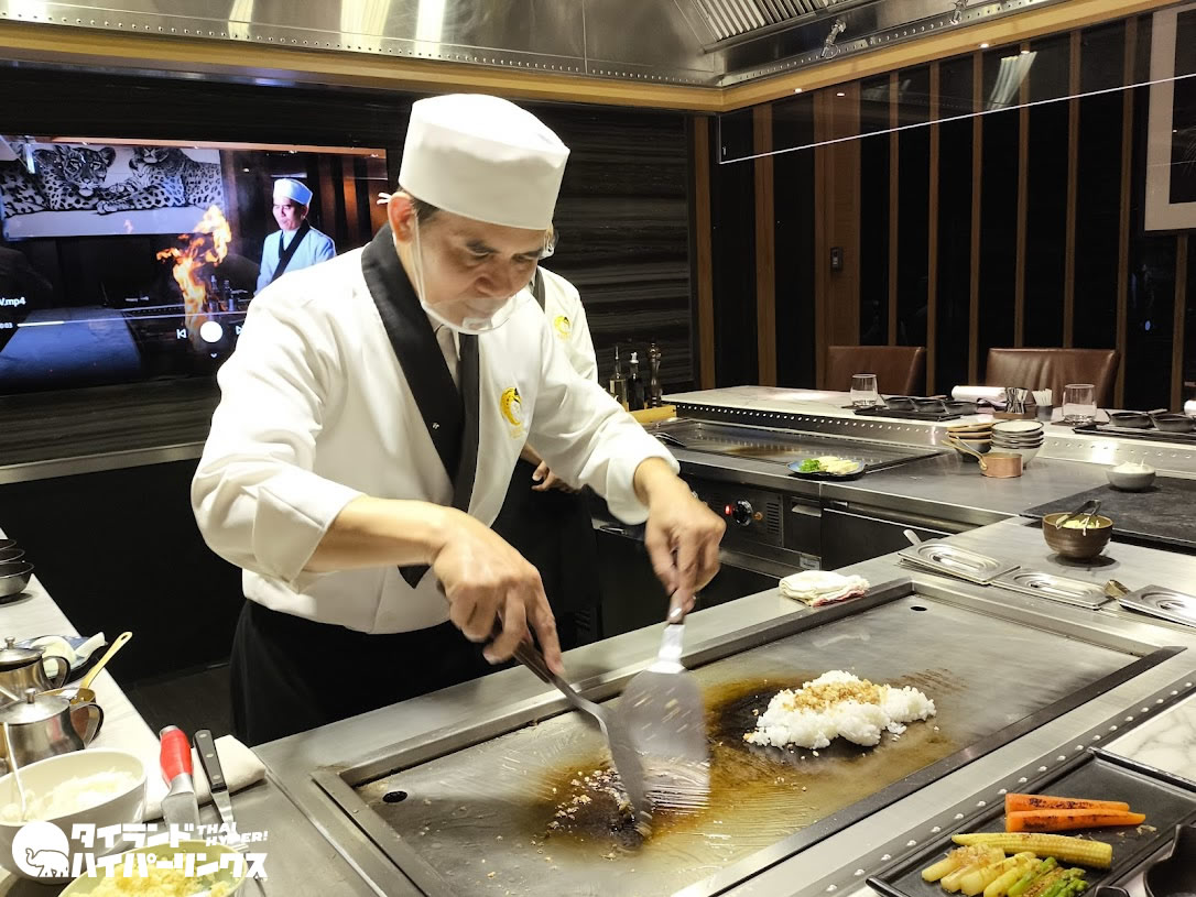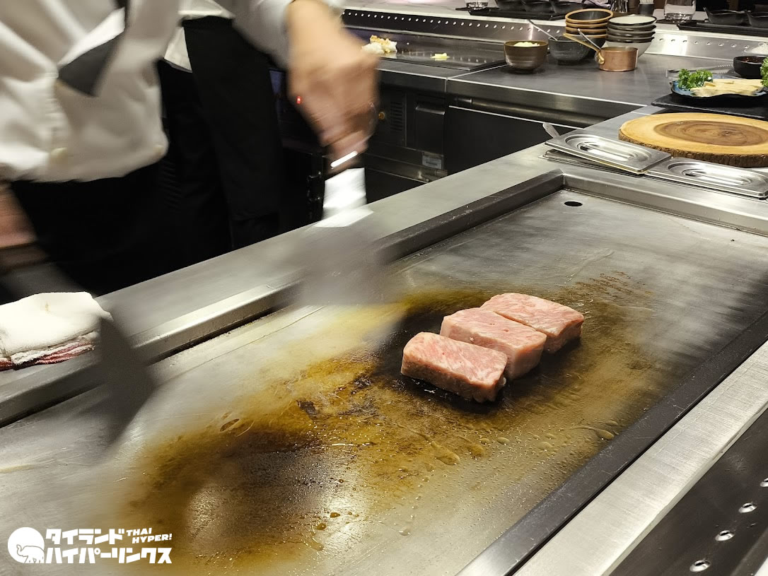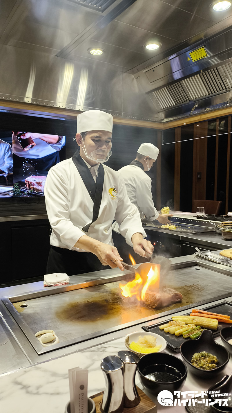 席に着くと、目の前の鉄板ではすでにシェフが炎を操っている真っ最中。派手すぎない洗練された動きの中で火が舞い、これから始まる鉄板焼き体験への期待が一気に高まりました!