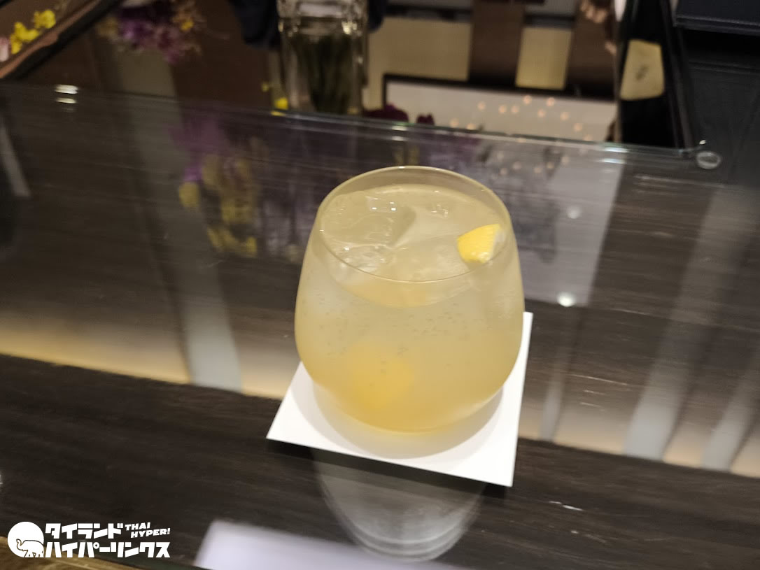 まず案内されたのはダイニングスペース手前の待合ラウンジのような落ち着いた空間でした。ここでウェルカムドリンクとしてモクテル(カクテルも選択可能)が提供され一息です。