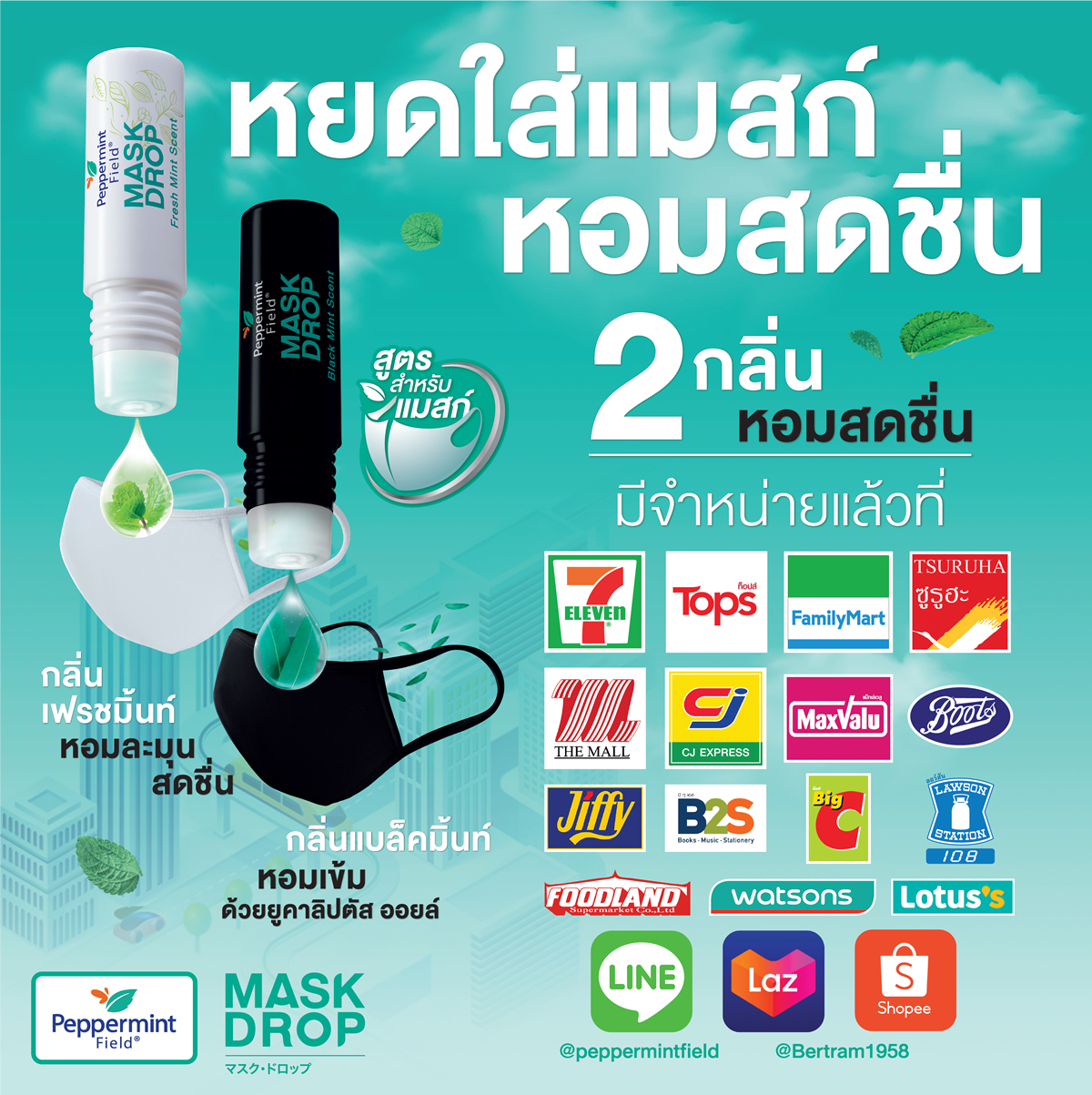 ミントが香るマスクをつくる「マスク・ドロップ」は、セブンイレブン、TOPSスーパーマーケット、ファミリーマート、ローソン108、ツルハなどの店舗や、LazadaやShopeeなどオンラインでも購入可能。気になる方は、是非お試しください!