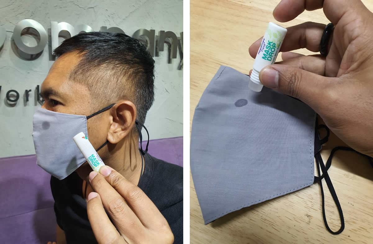 「マスク・ドロップ」の使い方はとっても簡単。マスクの外側の、ちょうど鼻をカバーする辺りの左右2箇所に、1~2滴づつリキットを垂らすだけ。これでマスクを装着すれば、ミントの香りが1日中持続し、スッキリした気分でいられるのです。これで猛暑の中でのマスク装着の不快感も大分和らぎますね!