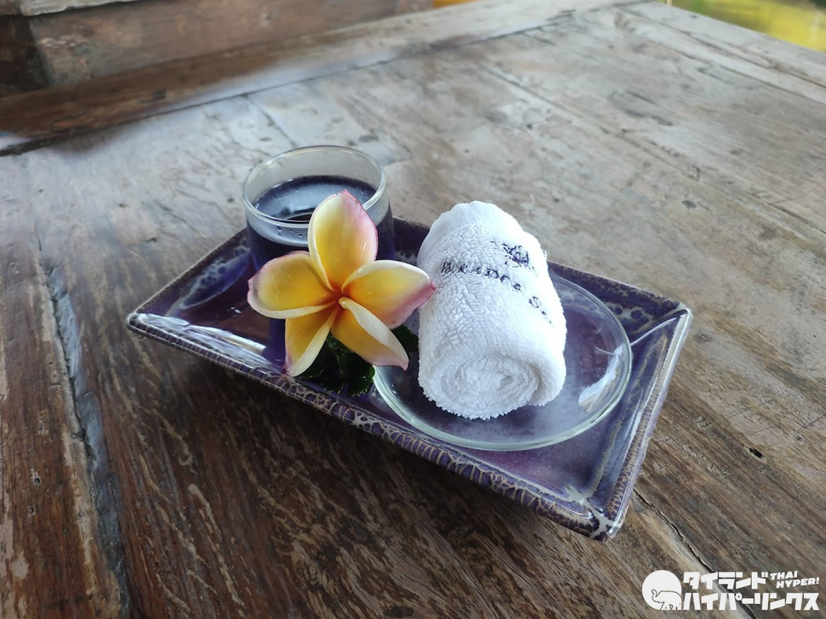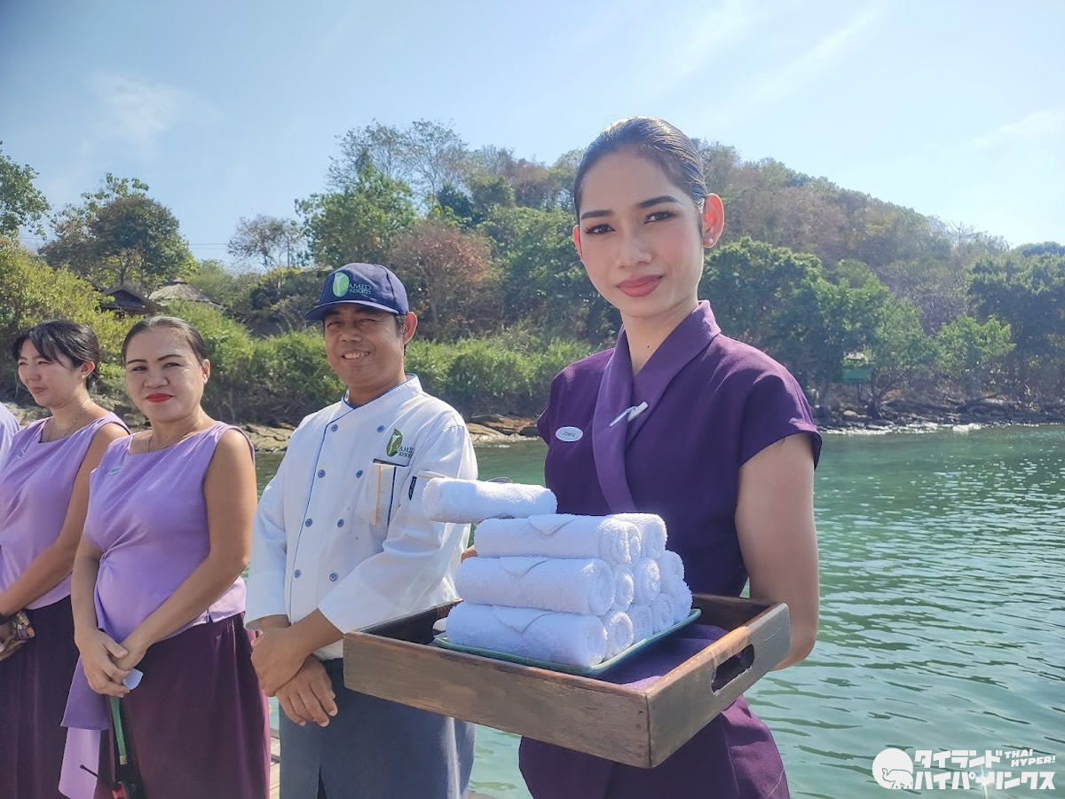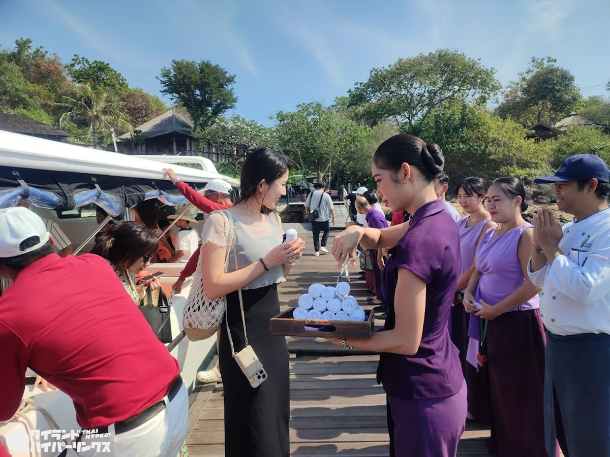 スピードボートを降りたら、すかさずウエルカムおしぼり!