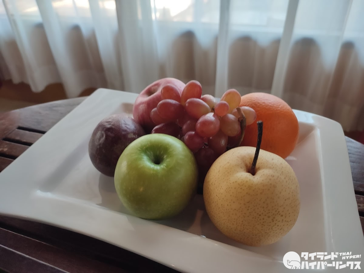 テーブルには、山盛りのウェルカムフルーツ。スイカやパパイヤなど南国フルーツは、朝食でたっぷりいただくことができます!