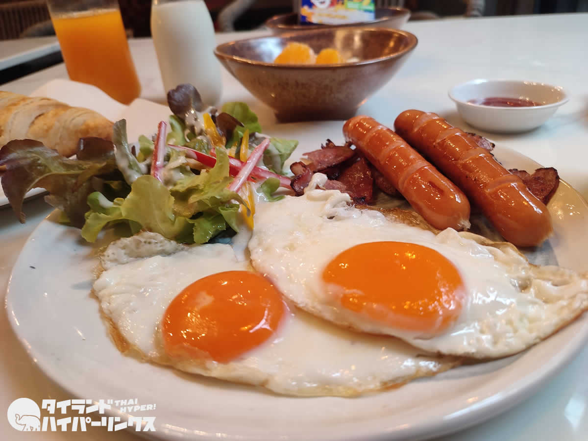 2つの目玉焼きとベーコンにソーセージ。それにサラダが添えられて、クロワッサンとコーンフレーク。さらにフルーツの入ったヨーグルトにオレンジジュース、牛乳もあって、ボリュームたっぷりのバンコク・シーロムの朝でした。