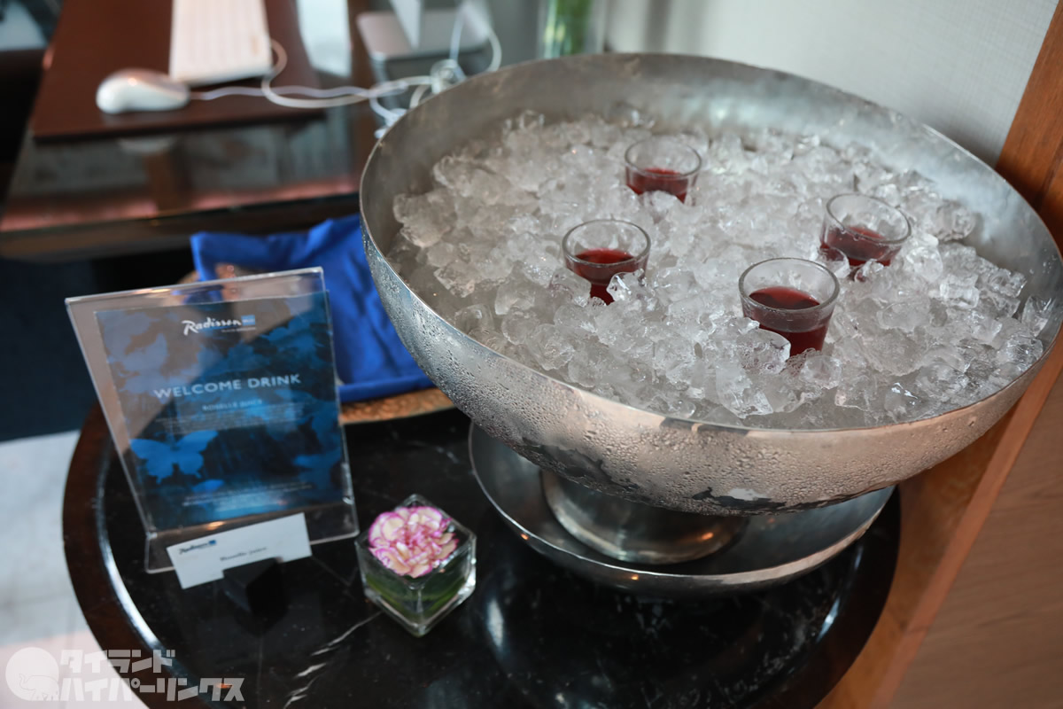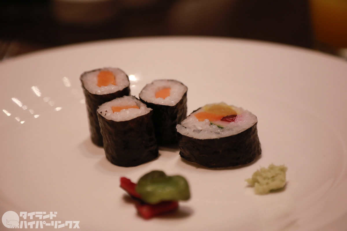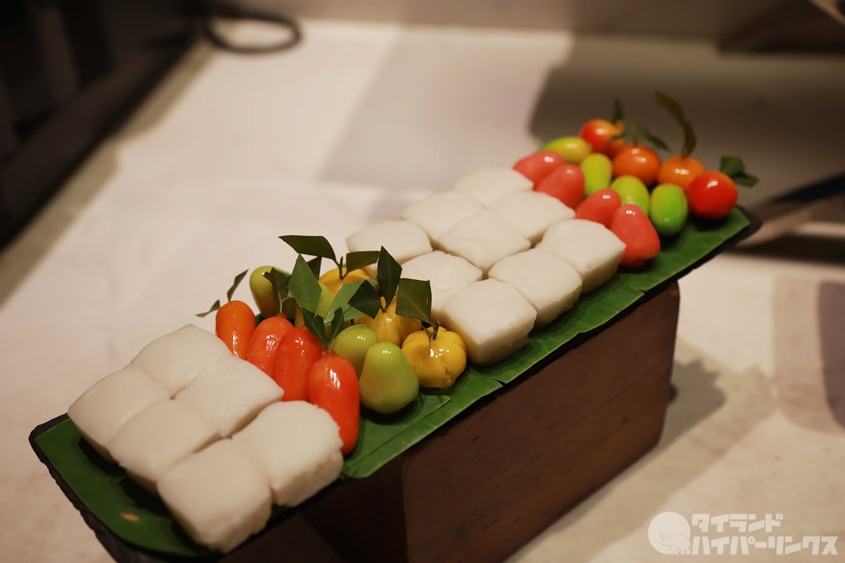 テーブルの上には、ウェルカムフルーツでなく、ウェルカム“カオニャオ・マムアン”が用意してありました。カオニャオ・マムアンとは、完熟マンゴーともち米にココナツミルクをかけていただく、タイ伝統スイーツ。「Radisson Blu」では寿司スタイルでした!