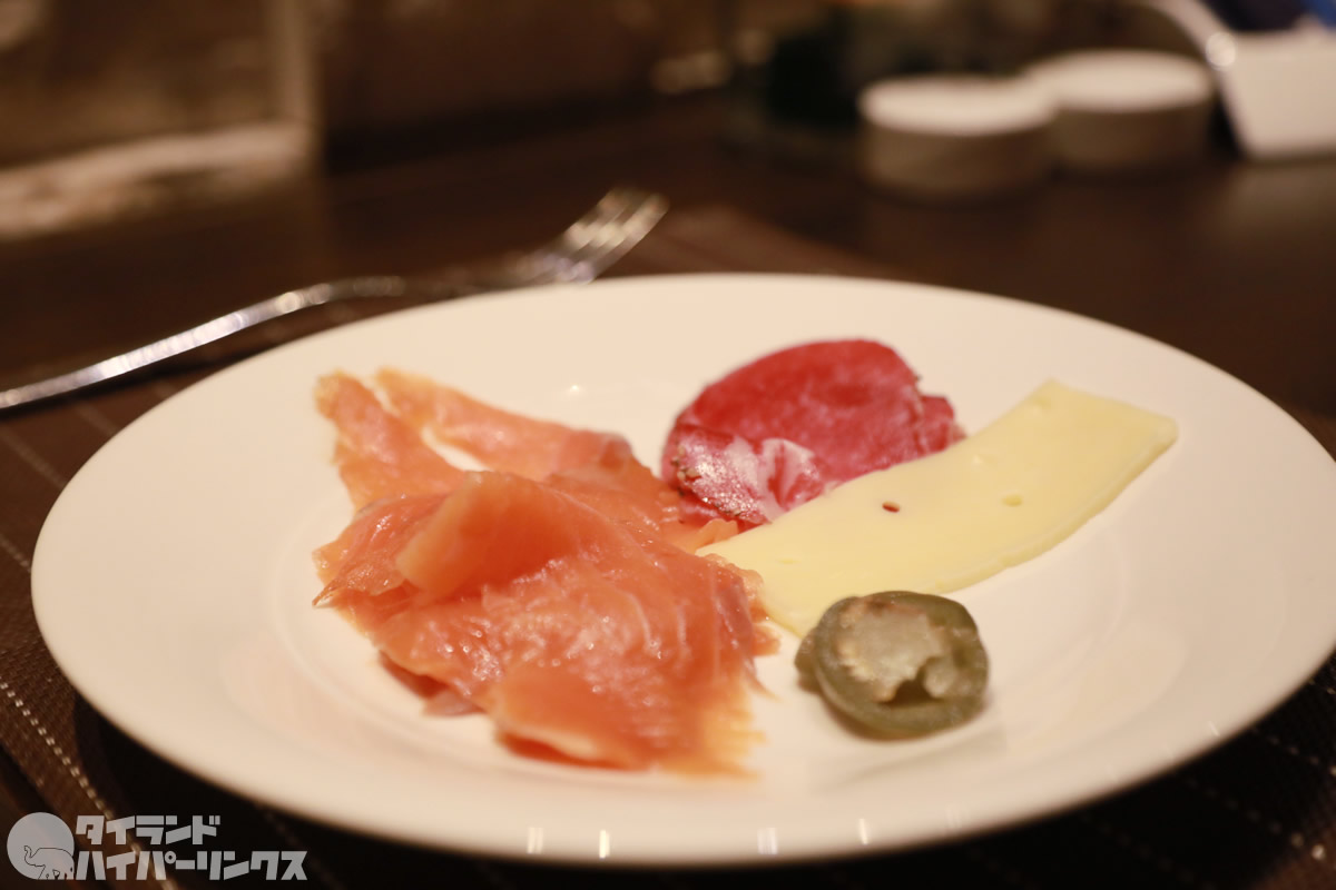スモークサーモンにチーズとオリーブ、そしてトマト。