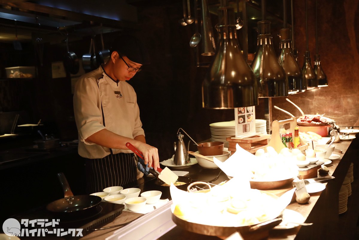 ホテルと言えば、オーダーに応じて調理してくれる卵コーナー。この日は定番のオムレツをチーズ多めでお願いしました。