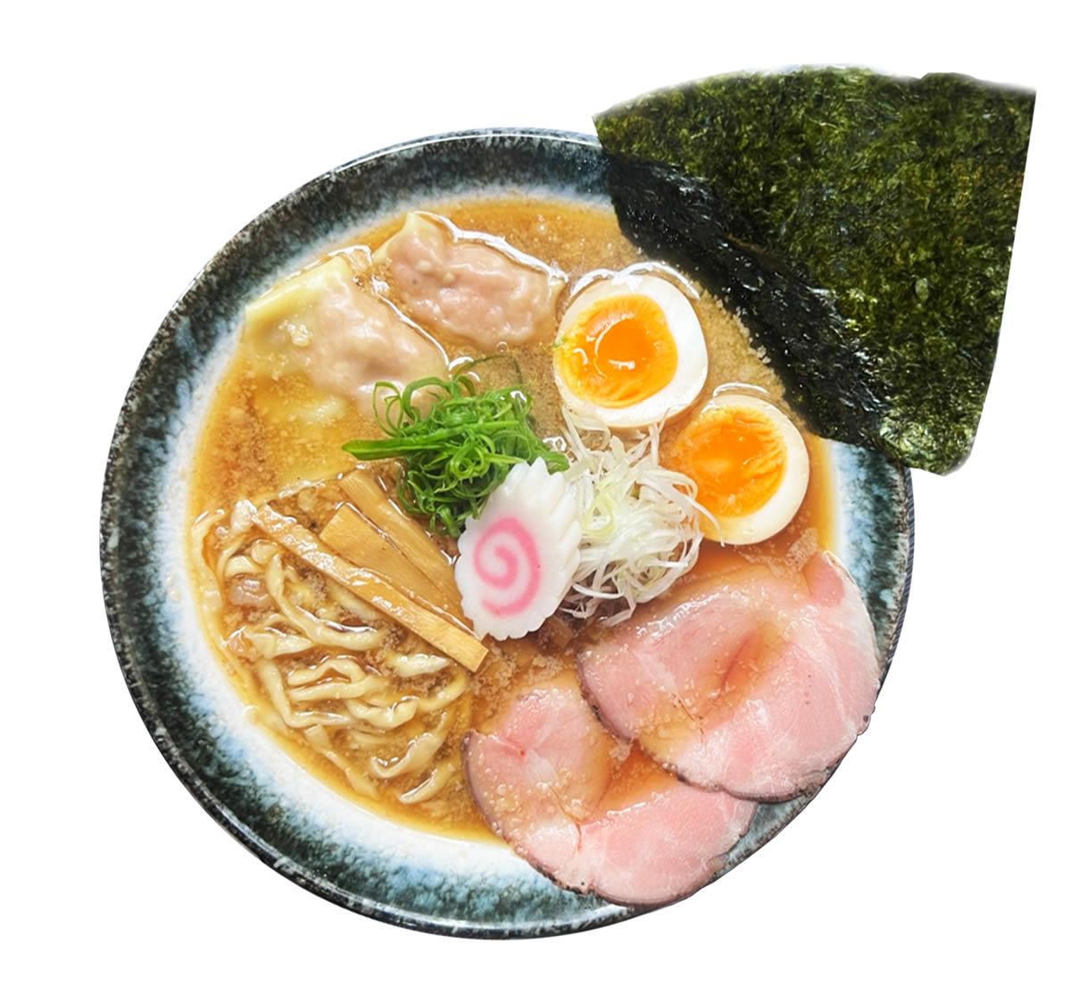 小麦香る極上の中太麺を茹でる直前に手揉みしました。 動物系を使っていないスープ、節系を惜しみなく使って います。醤油は風味豊かな昔ながらの技法を守っている醤油。和のスープをご堪能下さい。