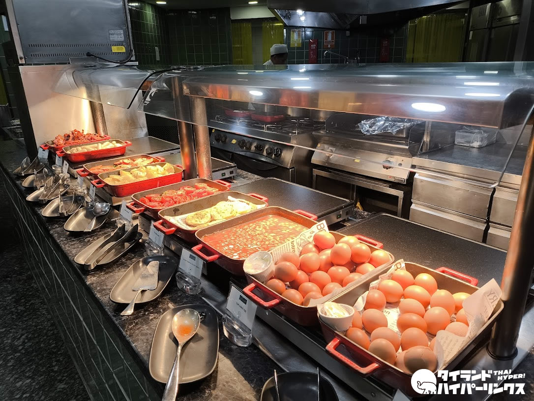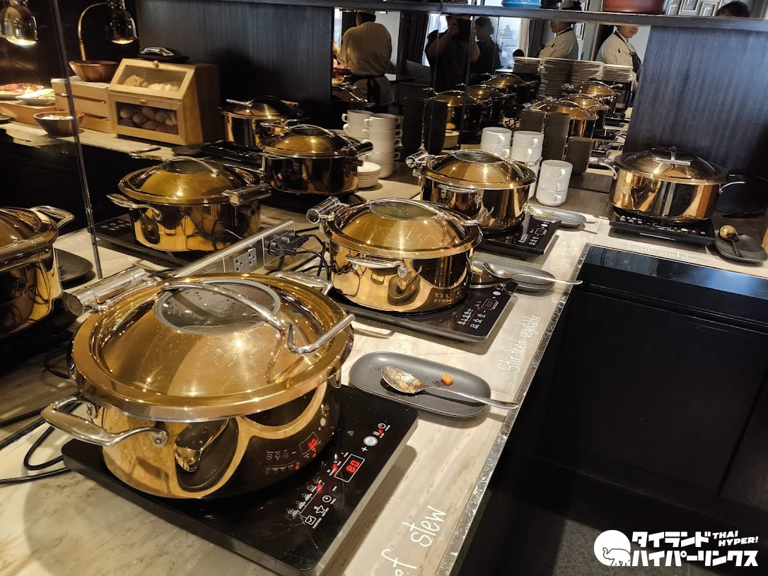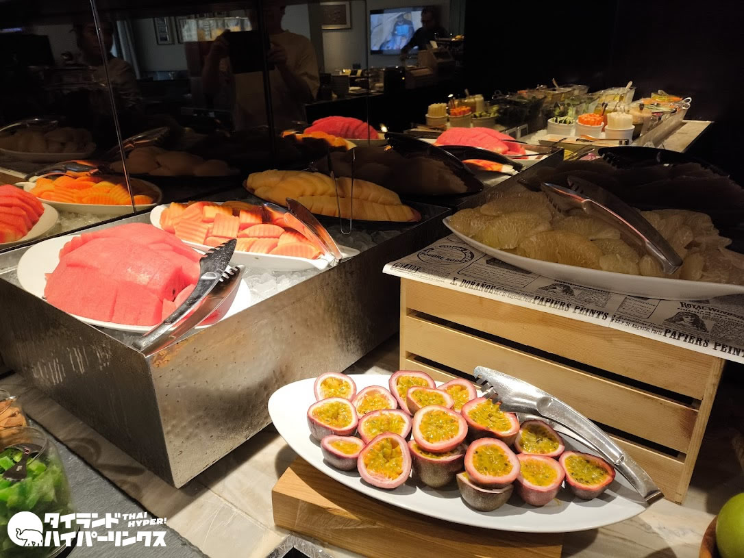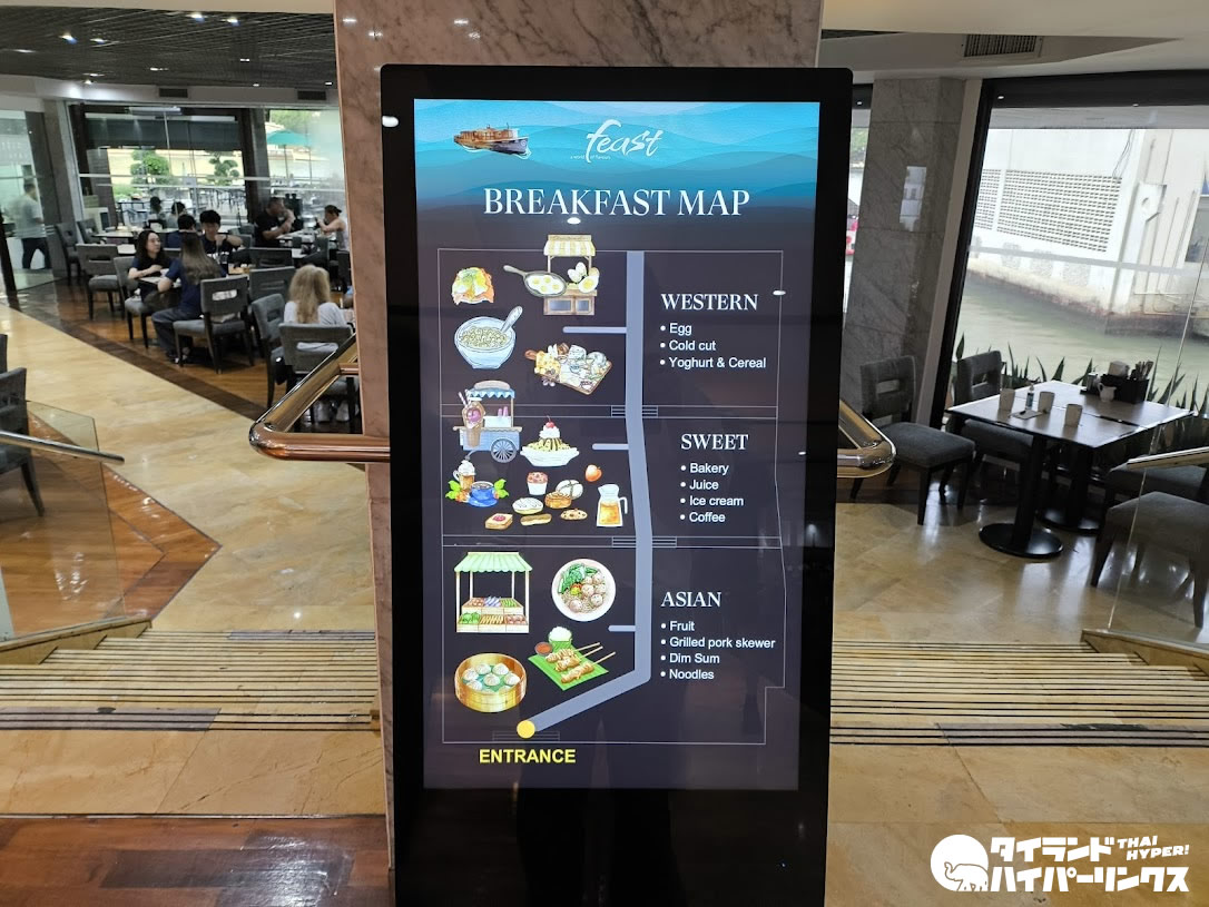 ホテルに宿泊する楽しみのひとつが朝食です。中でも大きなホテルの大会場での朝食はたまりません!下の写真はほんの一角。屋内だけでなく、チャオプラヤー川が目の前の屋外席も用意されています。