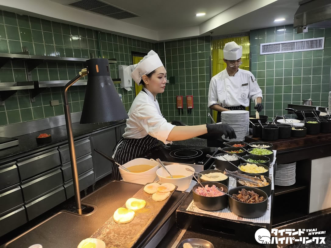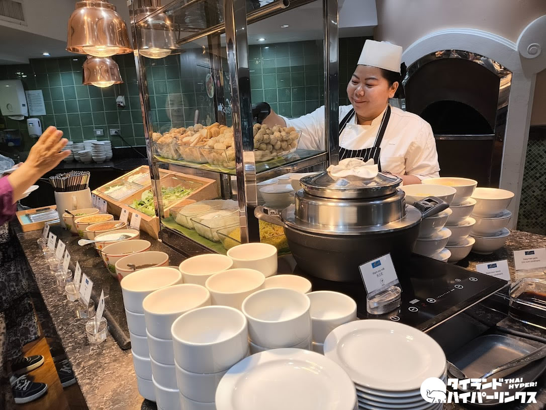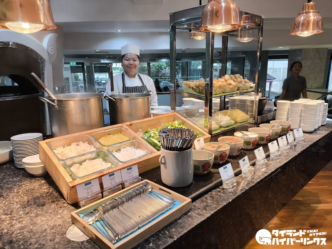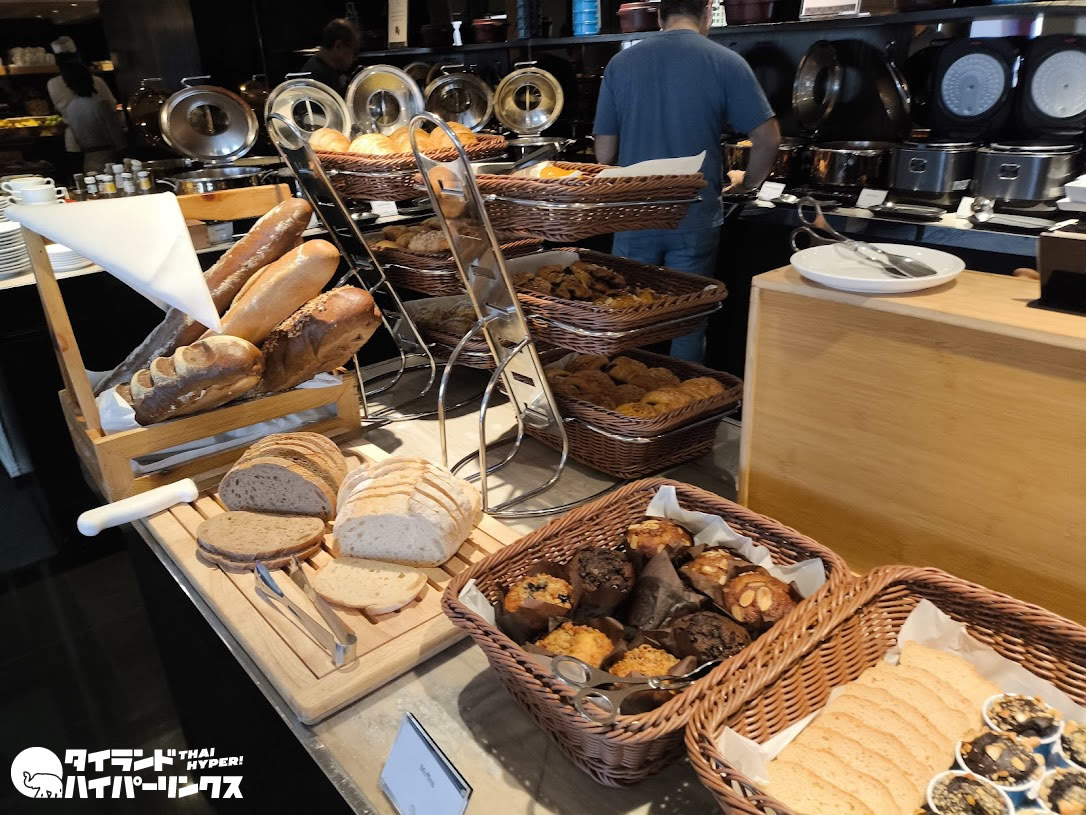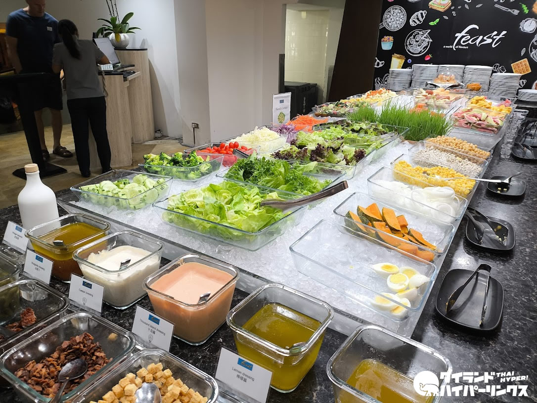 タイヌードルのコーナーや豊富なサラダ、パンなど種類も充実。
