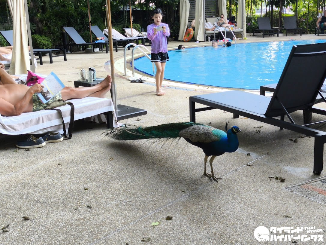 時間帯によってはプールサイドに孔雀が放されていて、今回もその姿を発見。こうしたちょっとした非日常も、このホテルならではの楽しさです。