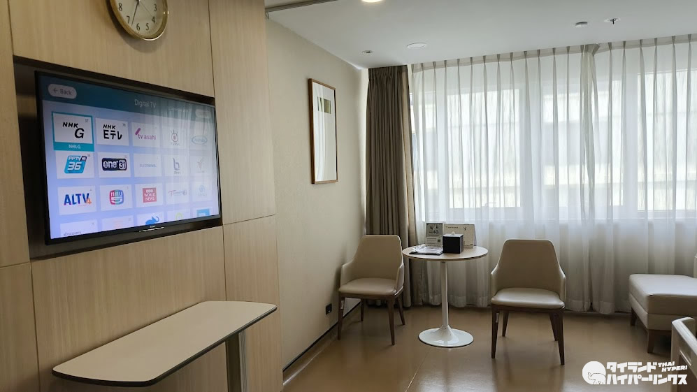 テーブルや大型のテレビもあって、まるでホテルのよう。テレビは日本のチャンネルも映るので、ゆっくりテレビを見ながら過ごすのが良さそうです。他にバスルームと小さなキッチンのエリアがあって、冷蔵庫にはポカリスウェットが入っていました。周りを見ると、ベッドにはパラマウントベッド、時計はセイコーで電子レンジはパナソニック、他も調度品などは日本製ばかり。これはできるだけ日本メーカーの製品を使うというサミティベート病院の方針によるものなのだそうです!