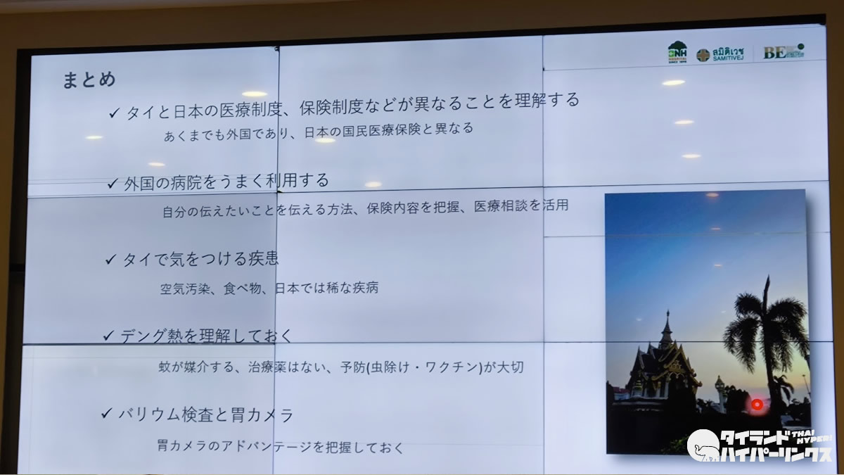 尾崎岳先生の講演は「日本とタイの医療の違い」についてのお話からスタート。そんな中で、会場にいた誰もが安心したであろう言葉が「タイの医療レベルは高い」でした。