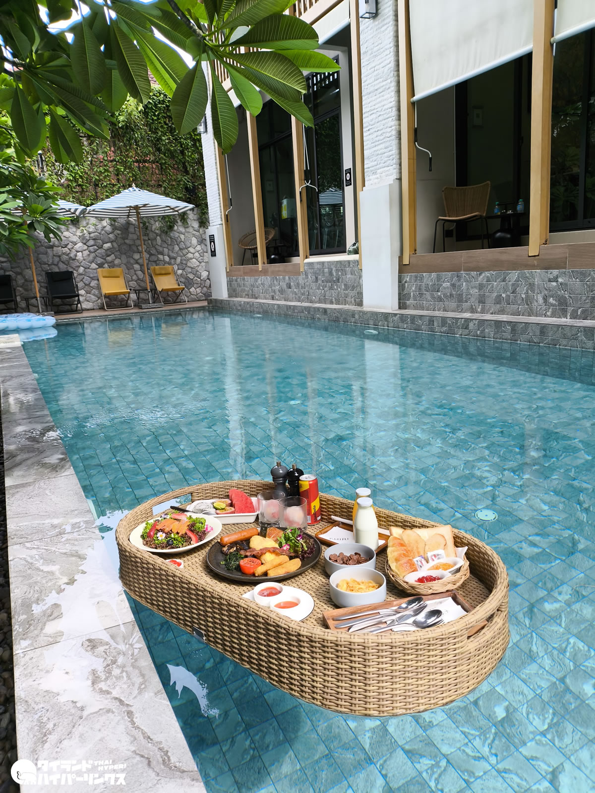 ビーチリゾートで人気の「フローティングブレックファスト」が、なんとここバンコク・オンヌットで体験できるんです。中庭のプールに浮かぶ朝食バスケットは見た目も豪華で、まさに映え必至の贅沢演出。バンコク在住でも「これは一度はやっておきたい」と思える、非日常感たっぷりの朝のひとときでした。