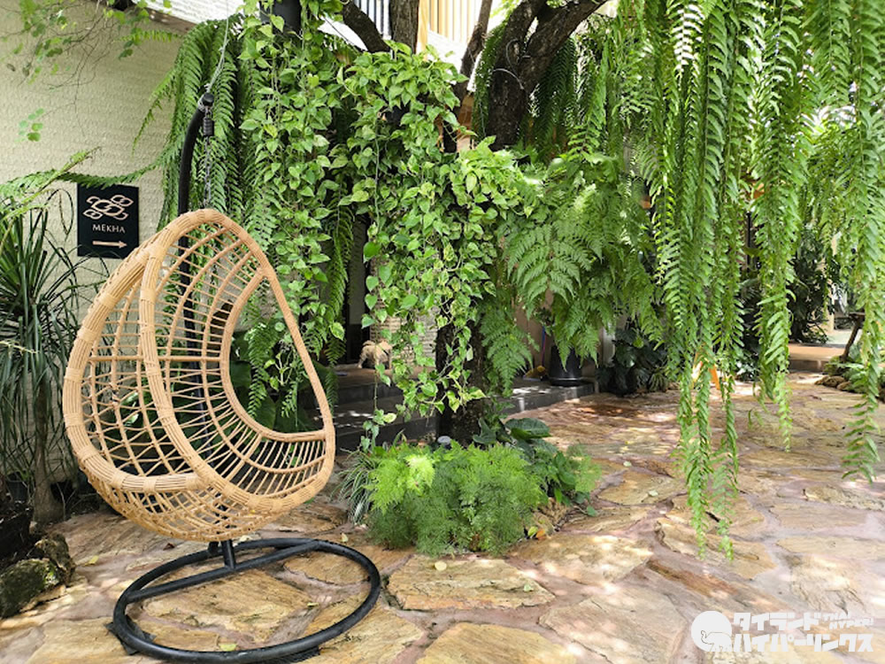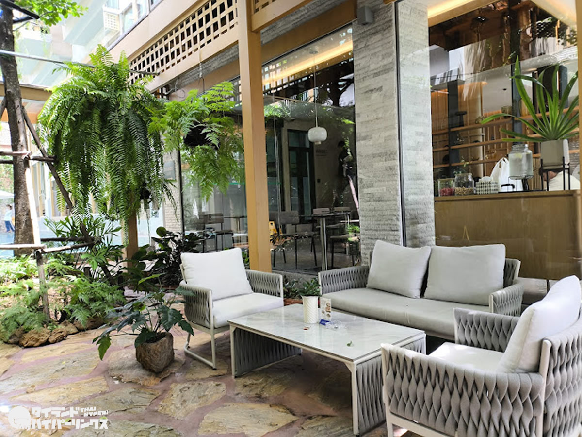 エントランスをくぐった瞬間、左手に飛び込んでくるのは、ジャングルのように生い茂った緑の中庭。南国植物に囲まれ、籐のチェアやベンチが配されたその空間は、「ここがバンコク?」と思わずつぶやいてしまうような非日常感に満ちた世界でした。