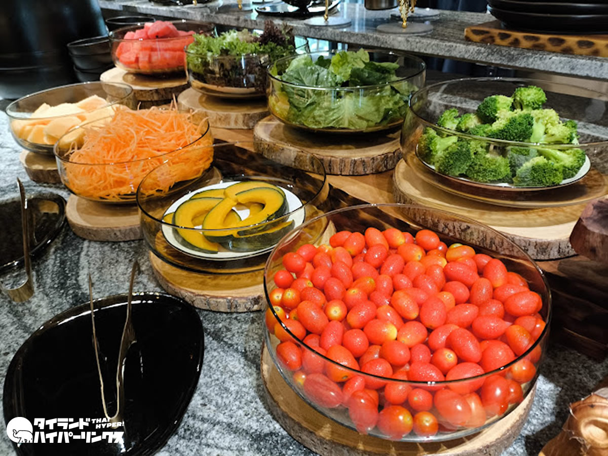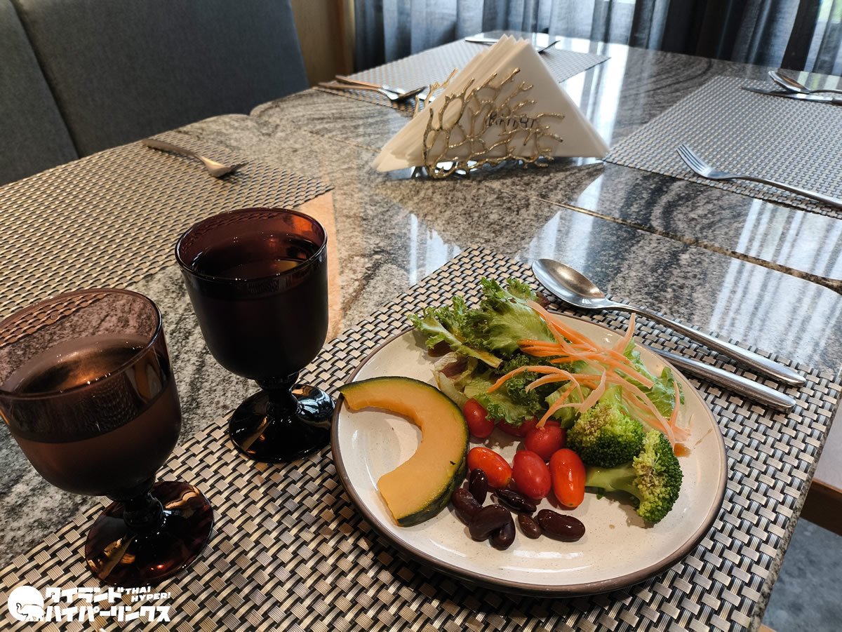 通常の朝食はロビーの上のレストラン「Khiri by Shan Villas」へ。サラダやドリンクなどはビュッフェ形式で自由に取れ、ホットミールはオーダー制。