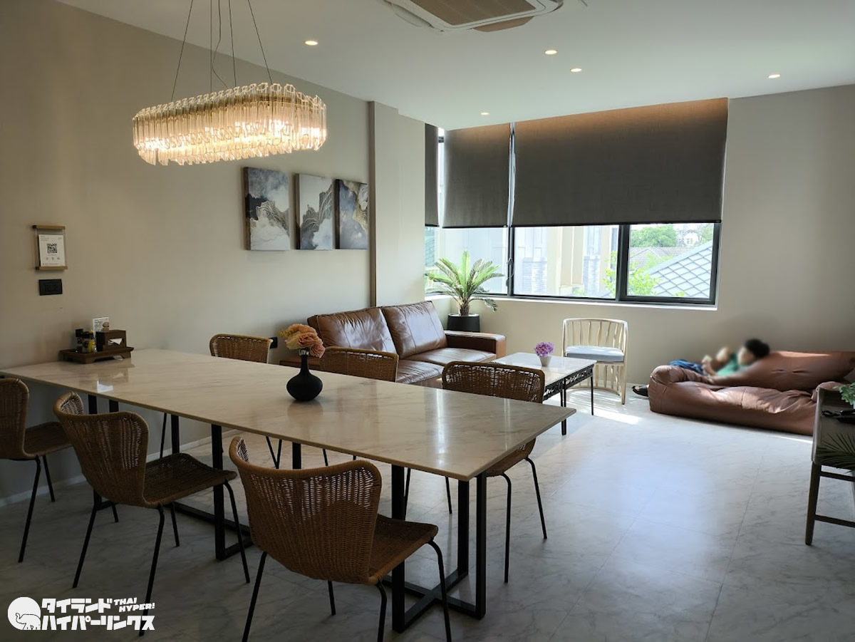 中央のリビングには、大きなソファや6人掛けのダイニングテーブル、ビーズクッションまで揃っており、ホームパーティーにもぴったりな空間です。もしろんWi-Fiは無料。