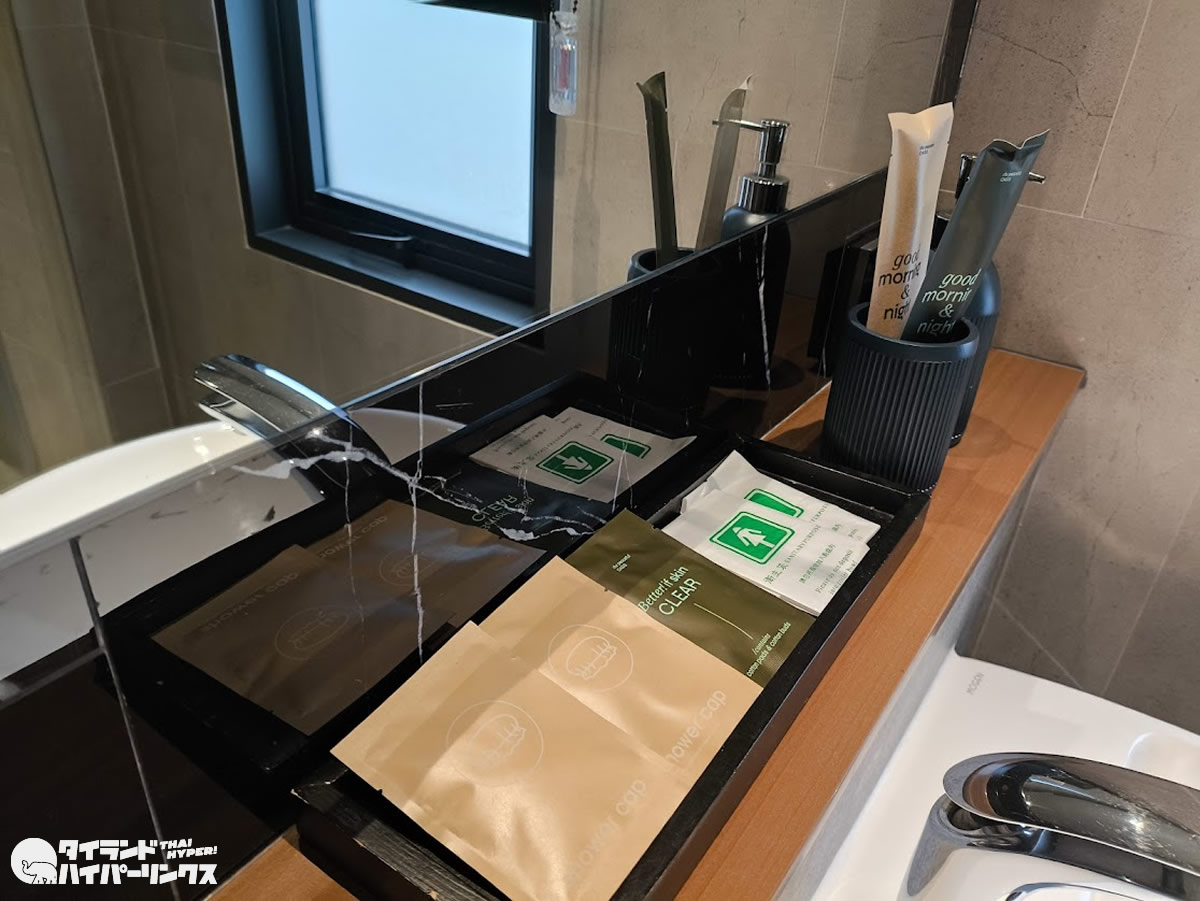 もちろん各部屋にトレイとシャワーもあり、歯ブラシなどもしっかり用意されていました。ドライヤーやセイフティーボックスも完備です。