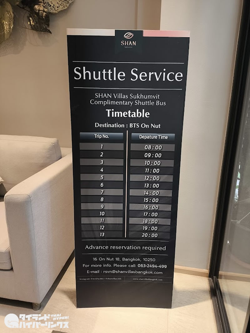 ホテルからBTSオンヌット駅までは無料シャトルバスが1日13便運行(8:00〜22:00/事前予約制)。オンヌット駅からは中心部のサイアム駅までは乗り換えなしで約20分。アクセスの良さと静かな立地の両立も、このホテルの大きな魅力です。
