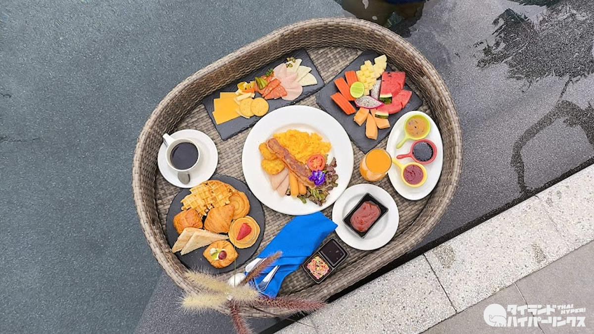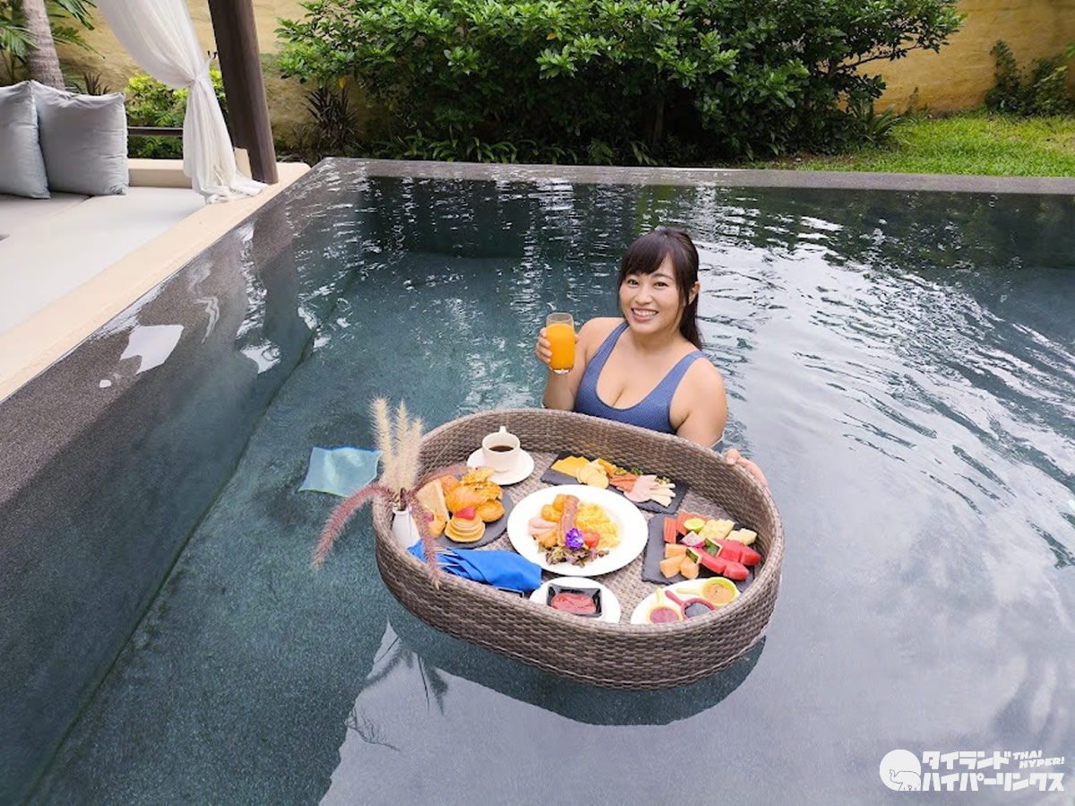 朝食は贅沢に「フローティングブレックファスト」。撮影を重視したい方には絶対おすすめの“アトラクション”。水に浸かりながら朝食を食べるなどという贅沢(?)は普通はできないので、この機会を逃すわけにはいきません。価格は800バーツ(込み込み)なので、ぜひ試していただきたいです!