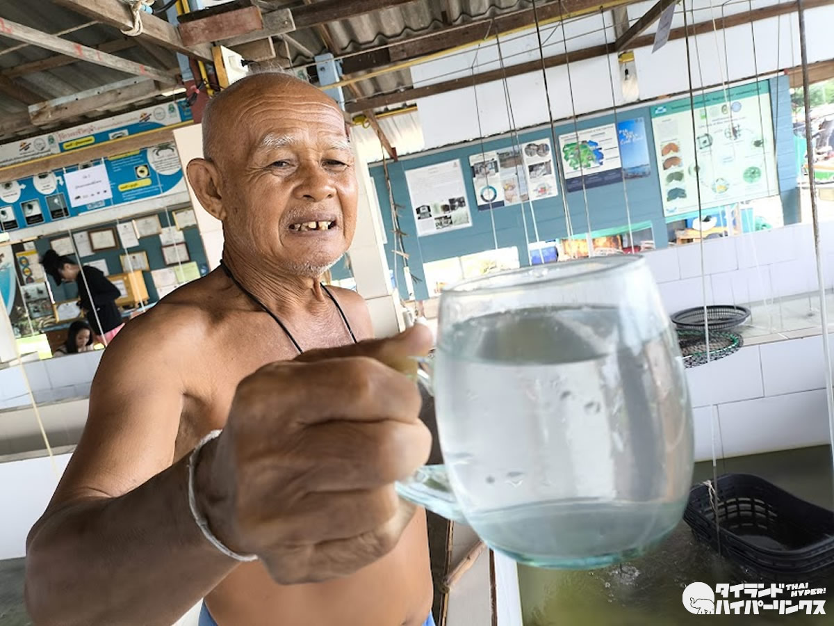 池から掬った水の入ったグラスには、たくさんのカニの赤ちゃんが泳いでいます。