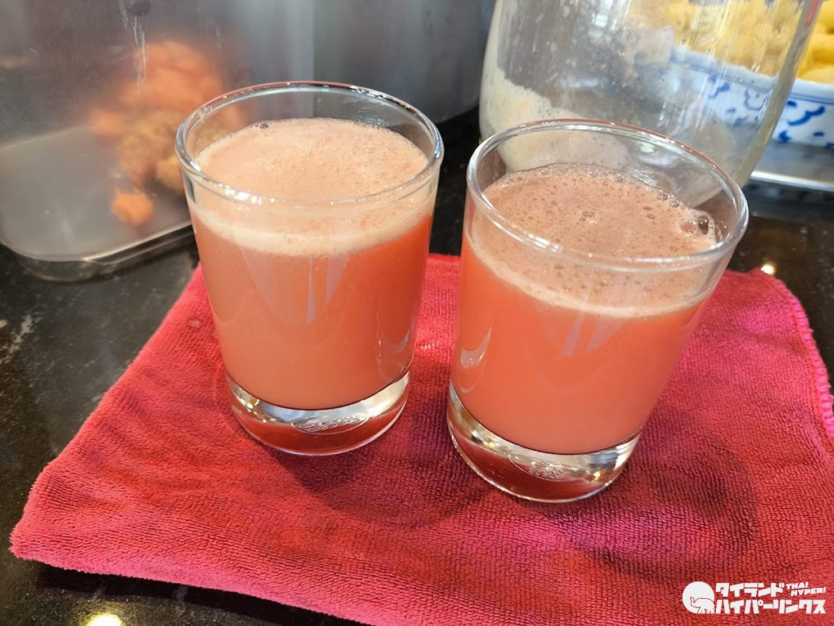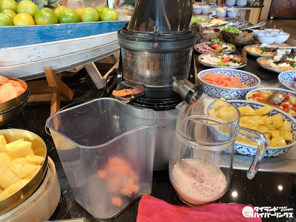 なお、カットフルーツの他にも、丸ごとフルーツが盛られているのですが、これはジュース用。好きなフルーツや野菜を機械に放り込めば、自分だけの美味しいジュースの出来上がりです。
