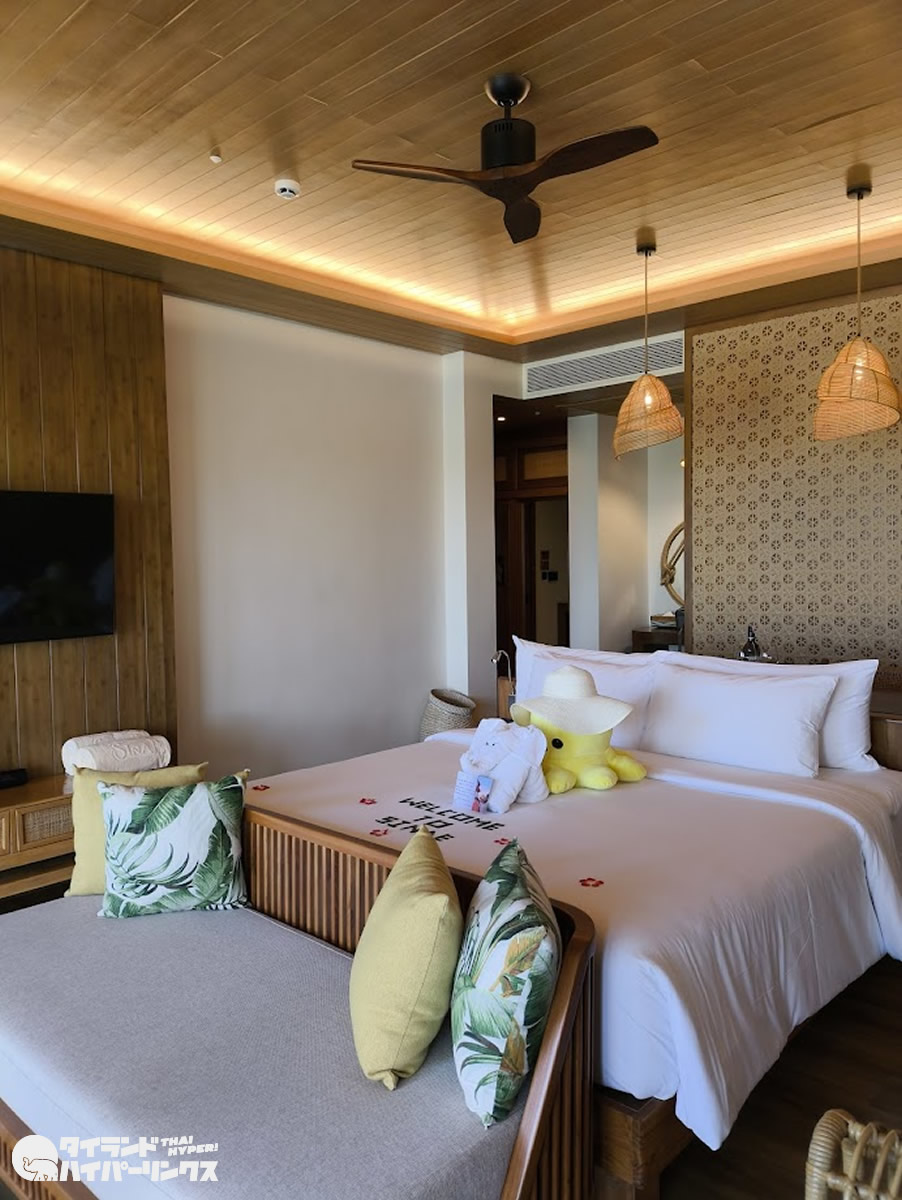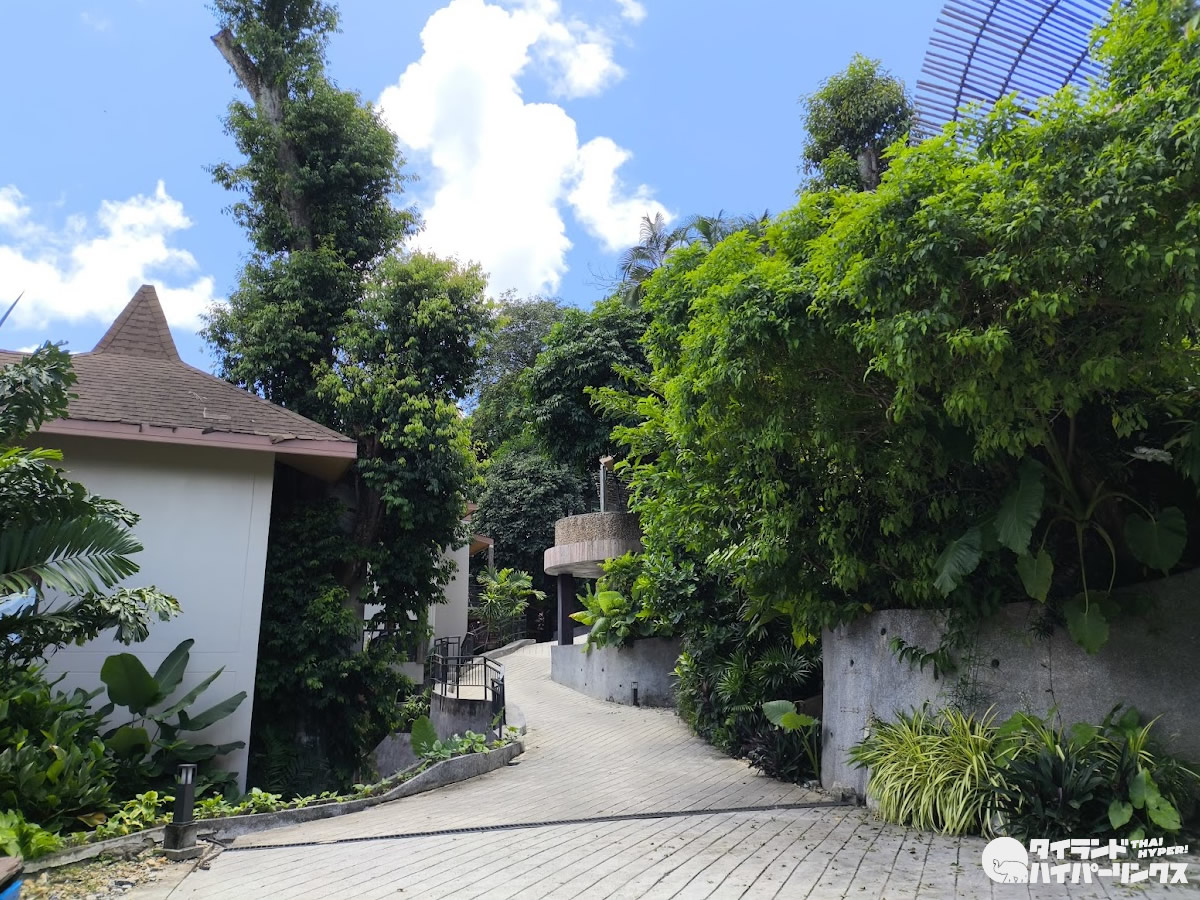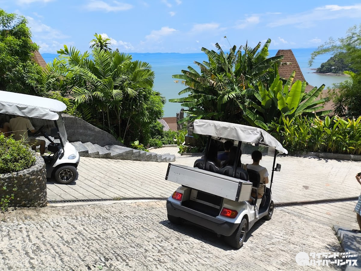 今回宿泊したのは「Sinae Sea Sai」という客室でした。客室まではロビーやレストランからも歩ける距離ですが、坂が急なのでちょっと疲れます。ということで、呼べばいつでもすぐに迎えに来てくれる、とっても楽なバギーに乗って向かいました。