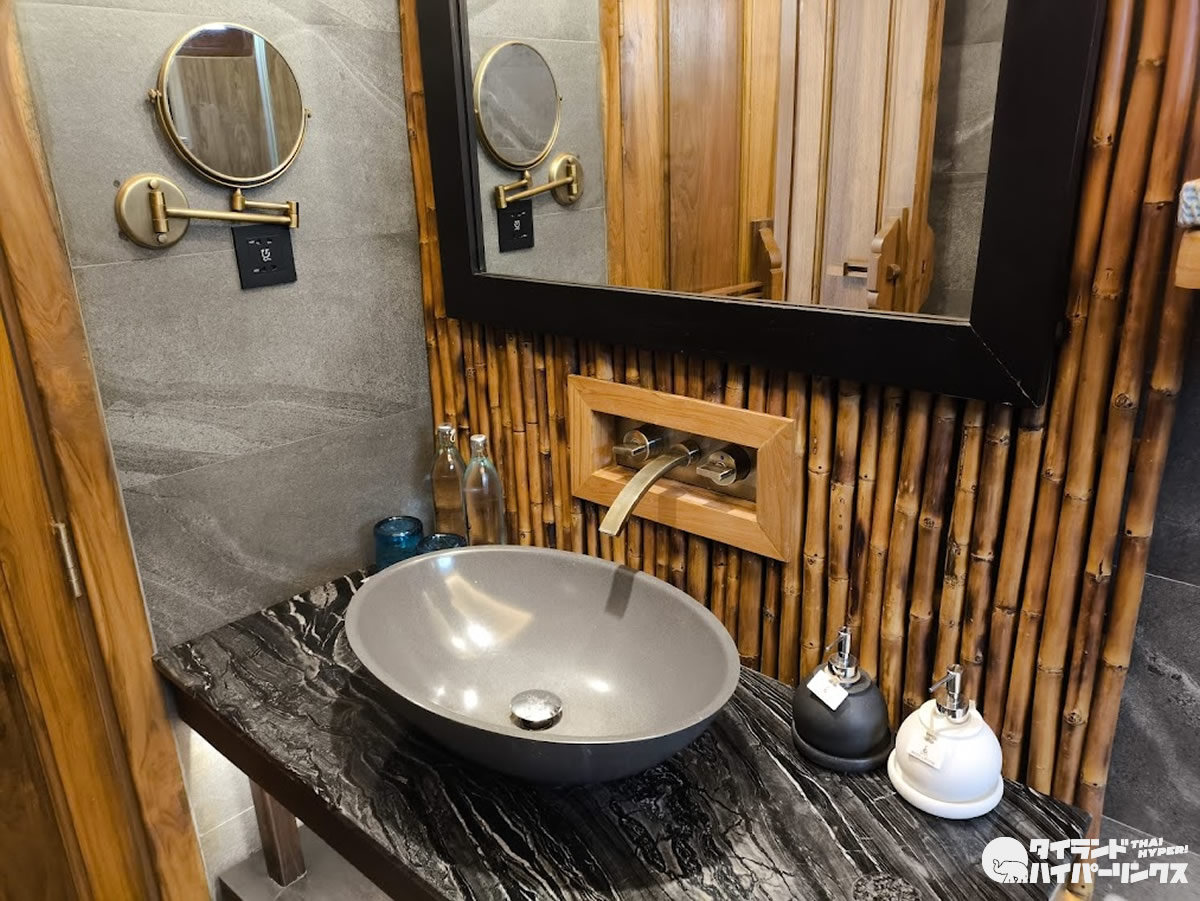 バスルームは、シャワールームとトイレと洗面台。もちろん歯ブラシなどのアメニティは揃っていて、シャンプーやコンディショナーも備え付けです。なお今回宿泊した「Sinae Sea Sai」にはバスタブありません。他のタイプの客室にはバスタブがついているので、お好みで選べますね。