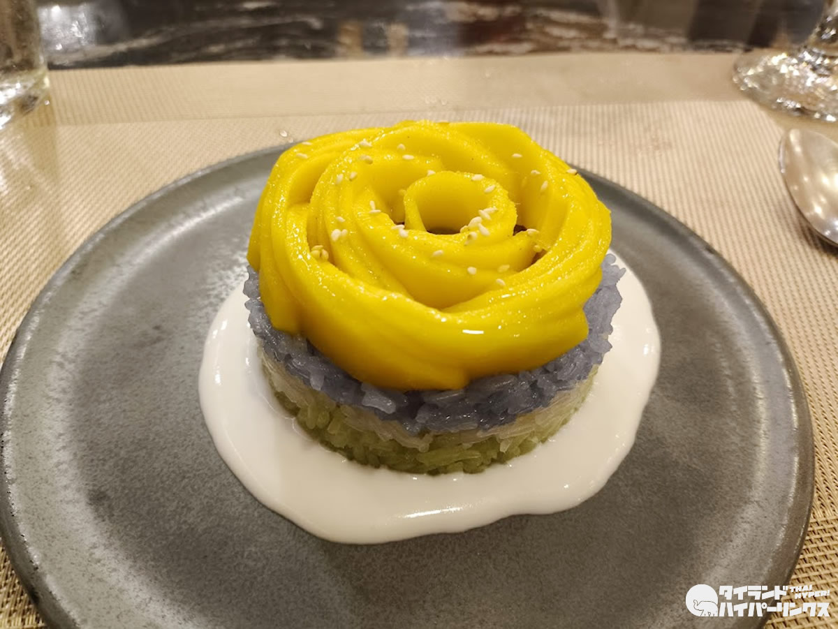 スイーツは定番の、もち米とマンゴーにココナッツミルクをかけた「カオニャオマムアン」。