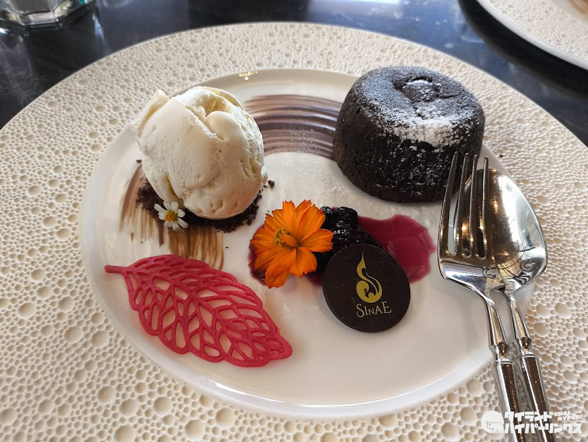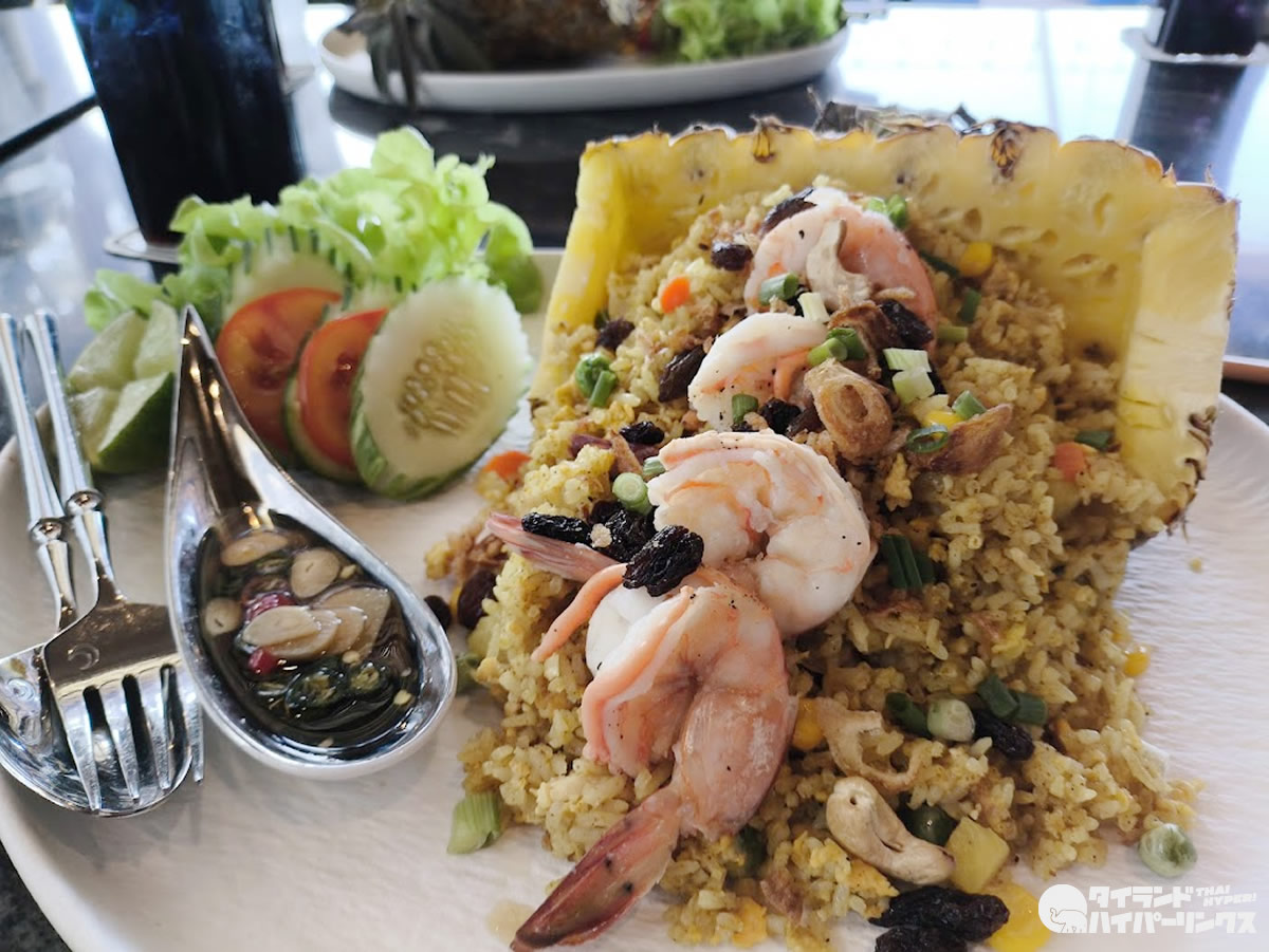 絶景の丘の頂上で食べるランチは格別でした!南国のリゾートらしく、パイナップルチャーハンと、とろけるチョコレートの極上スイーツのコラボ。パイナップルチャーハンはボリューム満点なので、2人で一皿でも良いかもしれないですね!