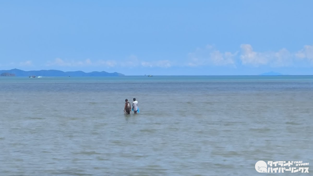 夕方なると潮が引いて、どこまでも遠浅。地元住民たちがカニや魚を捕っていました。