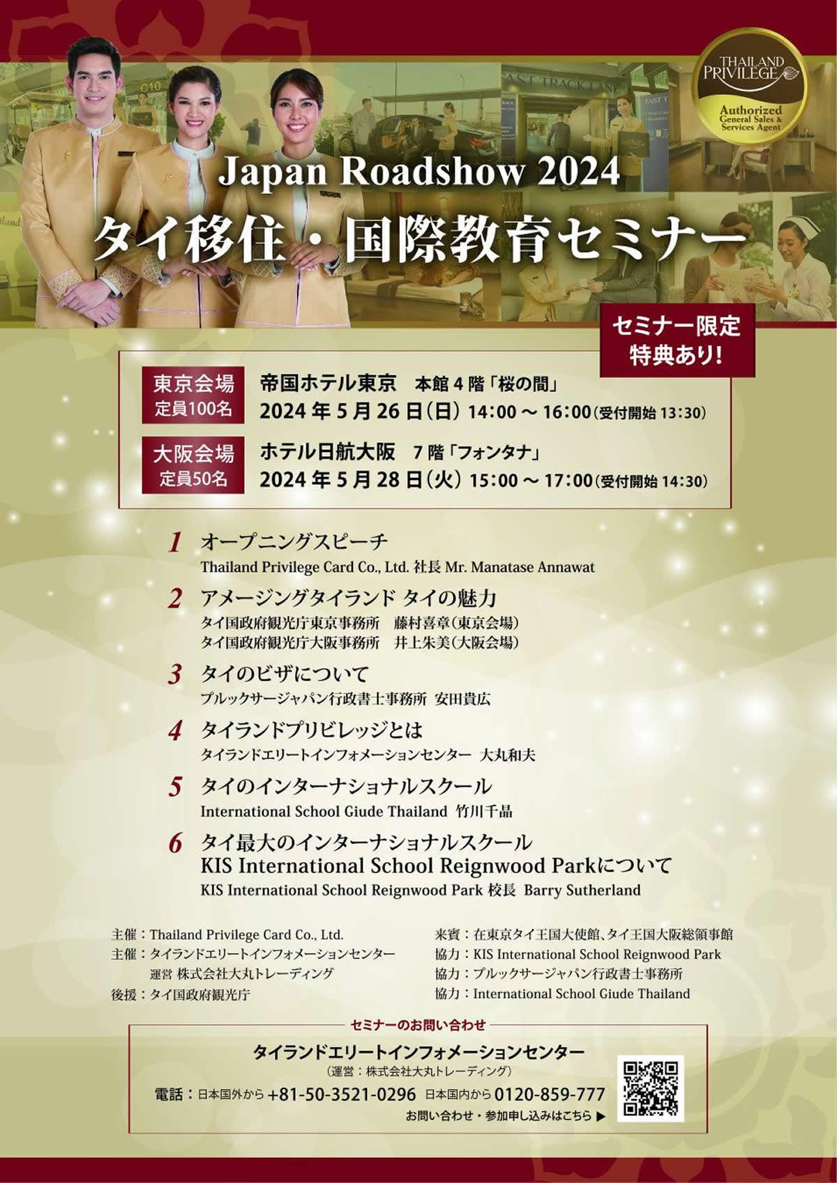 タイランドエリートインフォメーションセンター(運営:株式会社⼤丸トレーディング)は、タイ⻑期滞在プログラム「タイランドプリビレッジ」による公式無料セミナー【Japan Roadshow 2024 タイ移住・国際教育セミナー】を、東京で2024年5⽉26⽇(⽇)、⼤阪で2024年5⽉28⽇(⽕)に開催いたします。