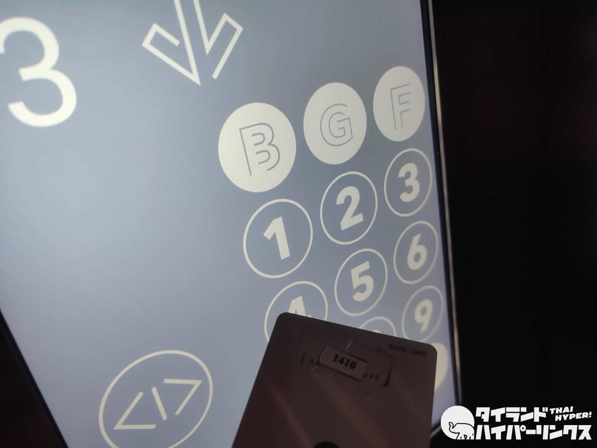 セキュリティーのため、部屋のカードキーとは別にエレベーター専用カードを使用します。階数ボタンは、カードの角で押すことで反応するので、指で押しても動きません!ここは注意ですね。