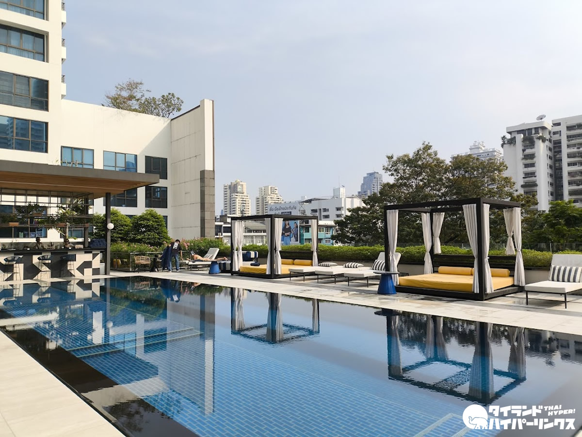 バンコクの都会の真ん中にある「TRIBE Living Bangkok Sukhumvit 39」ですが、5階にはゆったり過ごせるプールもあります。もちろんバーも併設されているので、お気に入りのドリンクを飲みながら過ごせます。