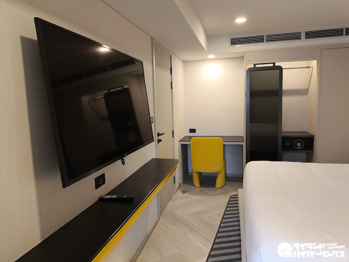 バスルームはベッドルームにもつながっています。ベッドルームにも大きなテレビがあり、デスクとクローゼット。セイフティボックスもあって安心です。
