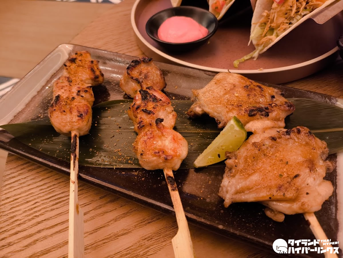夜景を眺めているうちに、料理の準備も完了。タコスなどのお馴染みのメキシコ料理から、刺し身をアレンジしたメキシコ風料理、さらにサーモン巻きや焼き鳥などの日本料理が並びました。