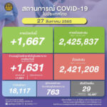 タイ保健省は2022年8月27日(土)、1日で確認された新型コロナウイルス陽性者が1,631人(海外[...]